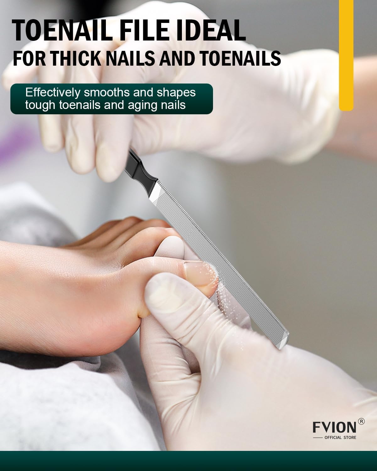 - Durable Stainless Steel - FVION foot nail file tools are used in anti-rust, solid, durable, water-resistant stainless steel. They can be washed directly with water to keep them clean, professional nail files are made with top-quality adhesive materials. Quick and easy to clean!