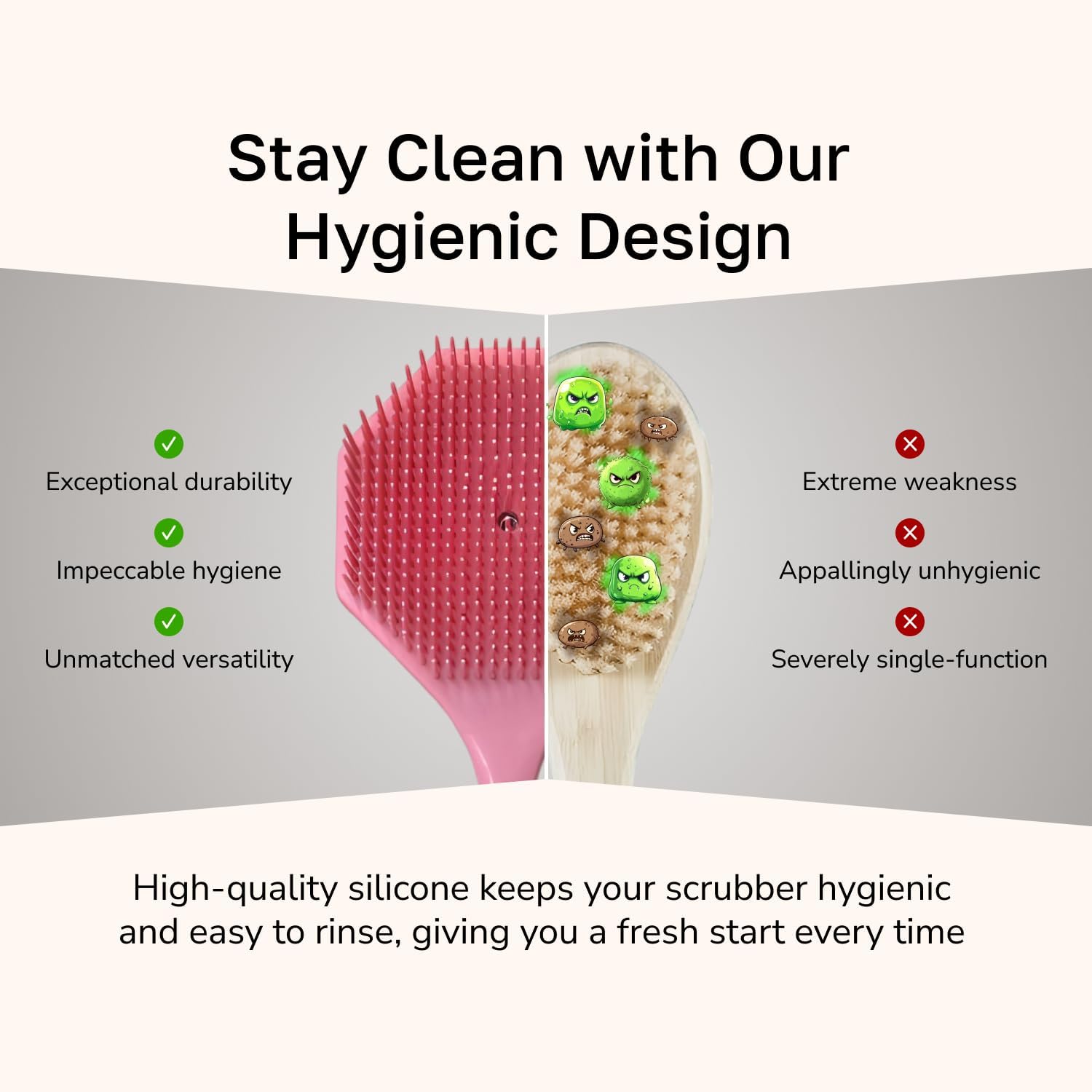 - Soft silicone that's gentle on your skin: Our scrubber is made of ultra-soft silicone that feels great on your skin but tough on dirt. It’s perfect for all skin types, even sensitive skin, giving you a soothing clean every day.