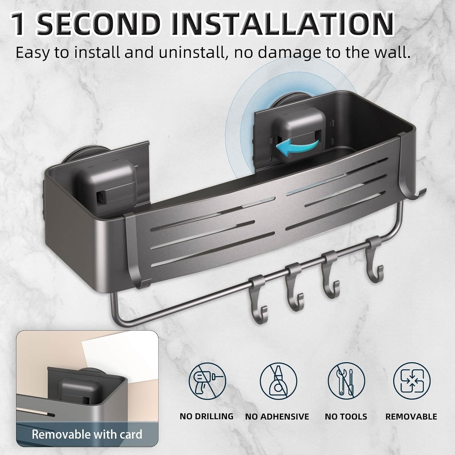 - One-Second Installation: This suction bath basket requires no drilling, screws, holes, or glue, making installation quick and hassle-free. Simply attach it to any smooth, clean, dry, flat, and non-porous surface. Remove the protective film, open the buckle, press firmly against the wall, and close the buckle to ensure a secure hold. Note: Make sure the wall has no water stains and dirt before installation to ensure the best possible adhesion