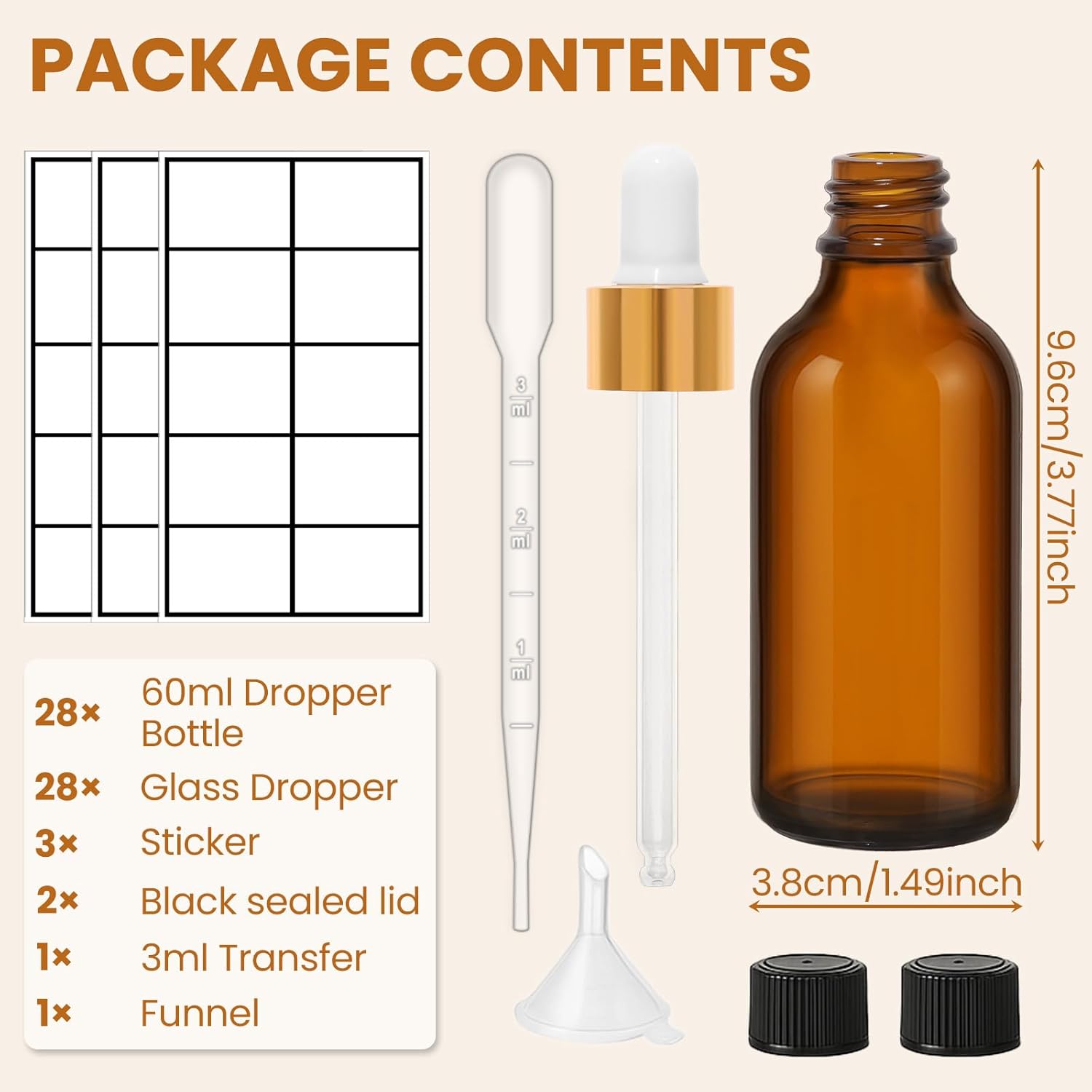 28 Pack 2oz Amber Glass Dropper Bottles with Gold Lids, Funnels, Droppers, Extra Caps & Labels – Leakproof, UV Resistant 60ml Empty Bottle for Tinctures, Essential Oils, Beard & Hair Oils