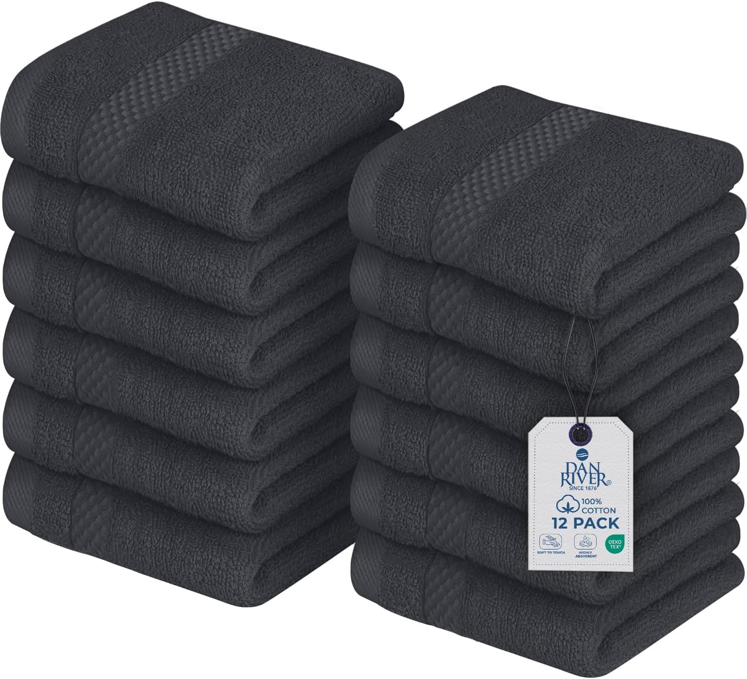 DAN RIVER 12-Pack Premium 100% Cotton Dark Gray Face Towels – Reusable Face Towel Set, Soft & Absorbent Small Wash Cloths for Bathroom & Body – Hand and Face Towels, 550 GSM (12x12 in)