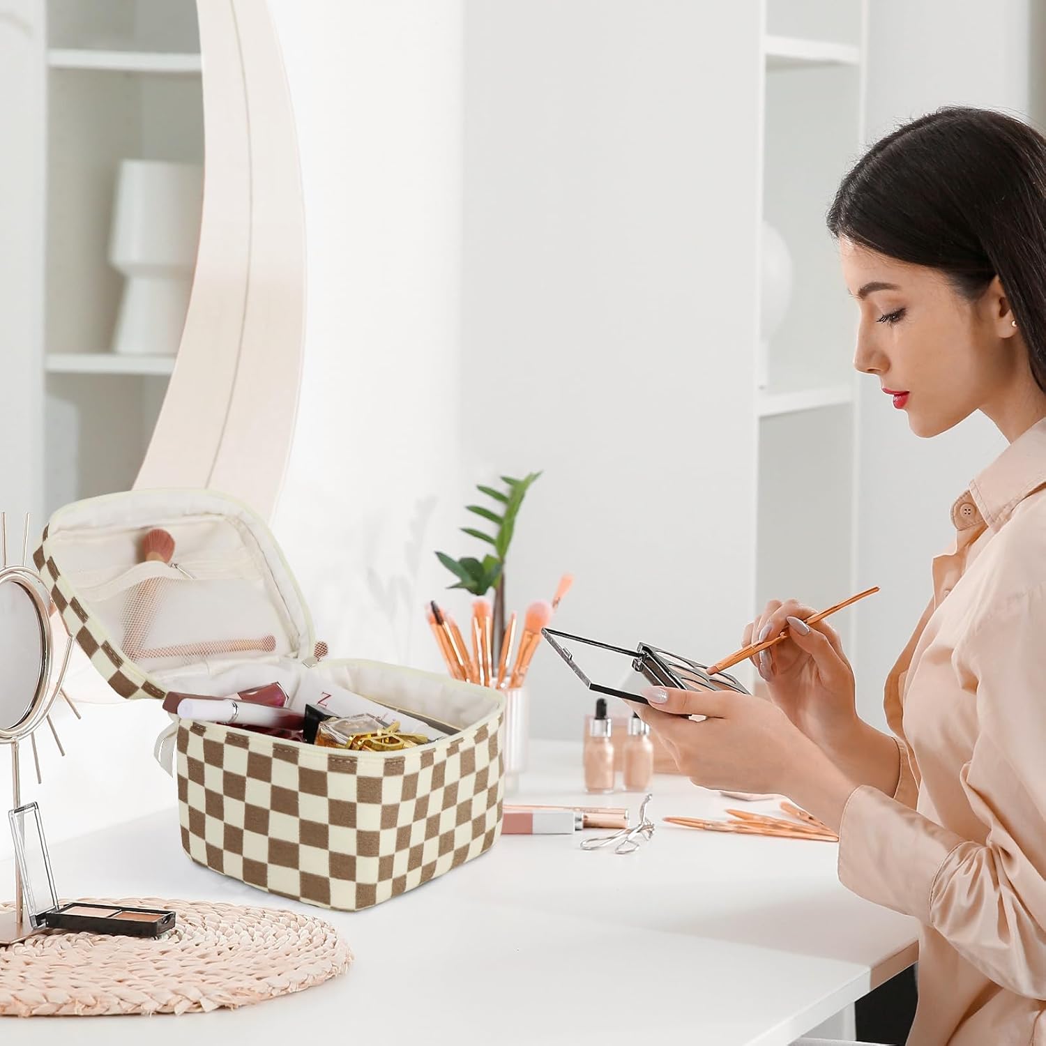Prite Corduroy Makeup Bag Quilted Makeup Bag Large Floral Cosmetic Bag for Women Cute Travel Toiletry Bag with Handle(Light Checkerboard)