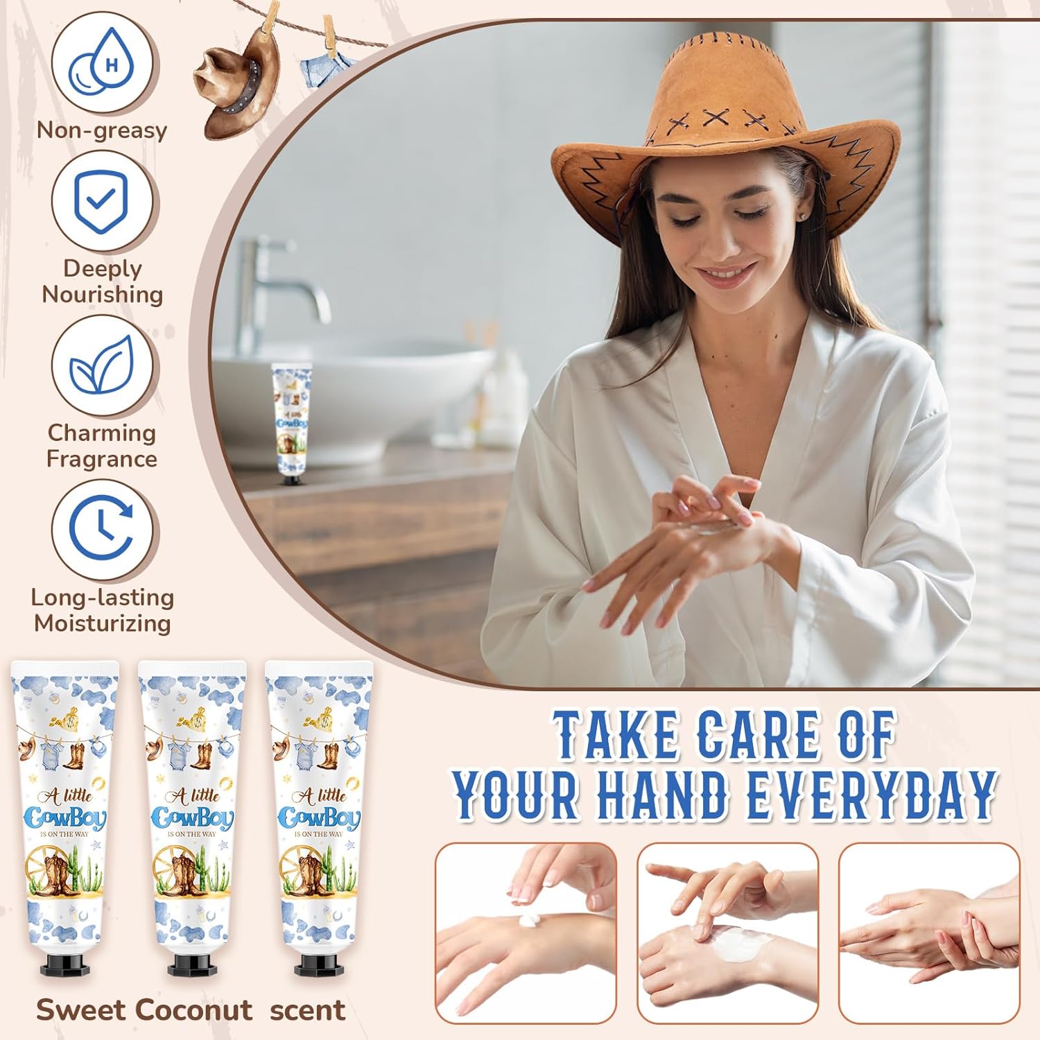 - Hand Cream Gift Set: you will receive 48 pieces of cowboy hand cream gift sets, includes 48 pieces of hand cream and 48 pieces of gift bags, the hand cream comes in coconut scents; Abundant quantity is enough for your daily use and replacement, and you can share them with your family, friends, colleagues