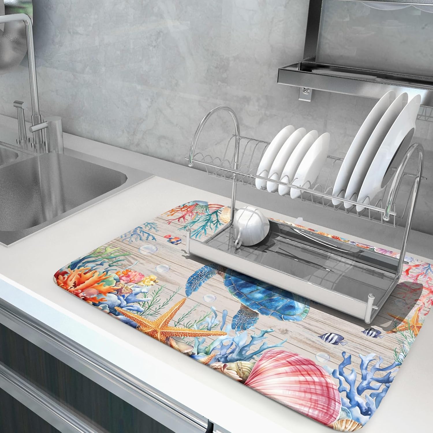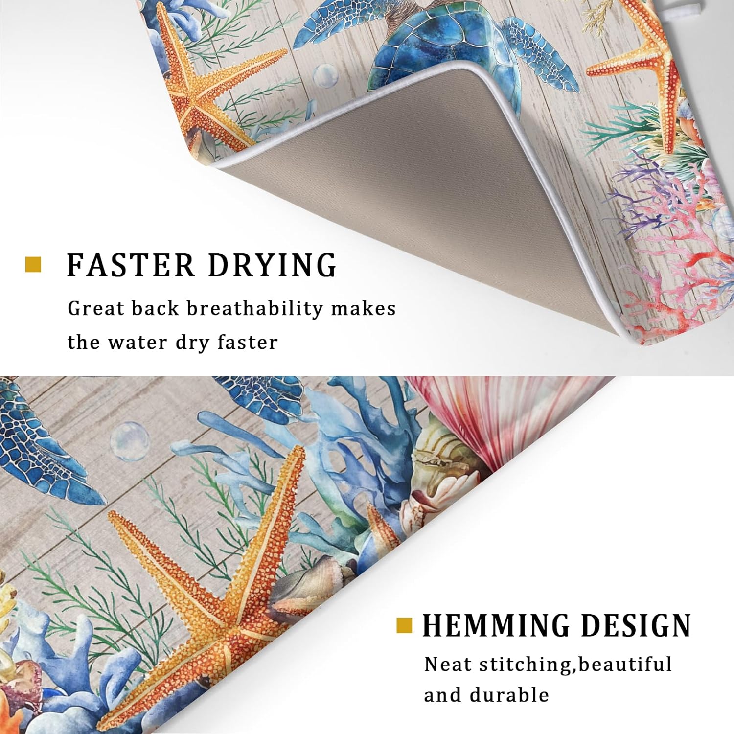 - 【Easy to Storage】This coastal coral design drying mat with hang rope, soft and foldable, durable, easy to storage it by hanging or folding it up in a drawer or tuck it elsewhere. Perfect for tight spaces like campers, boats and cottages where having a dual purpose item will come in handy.