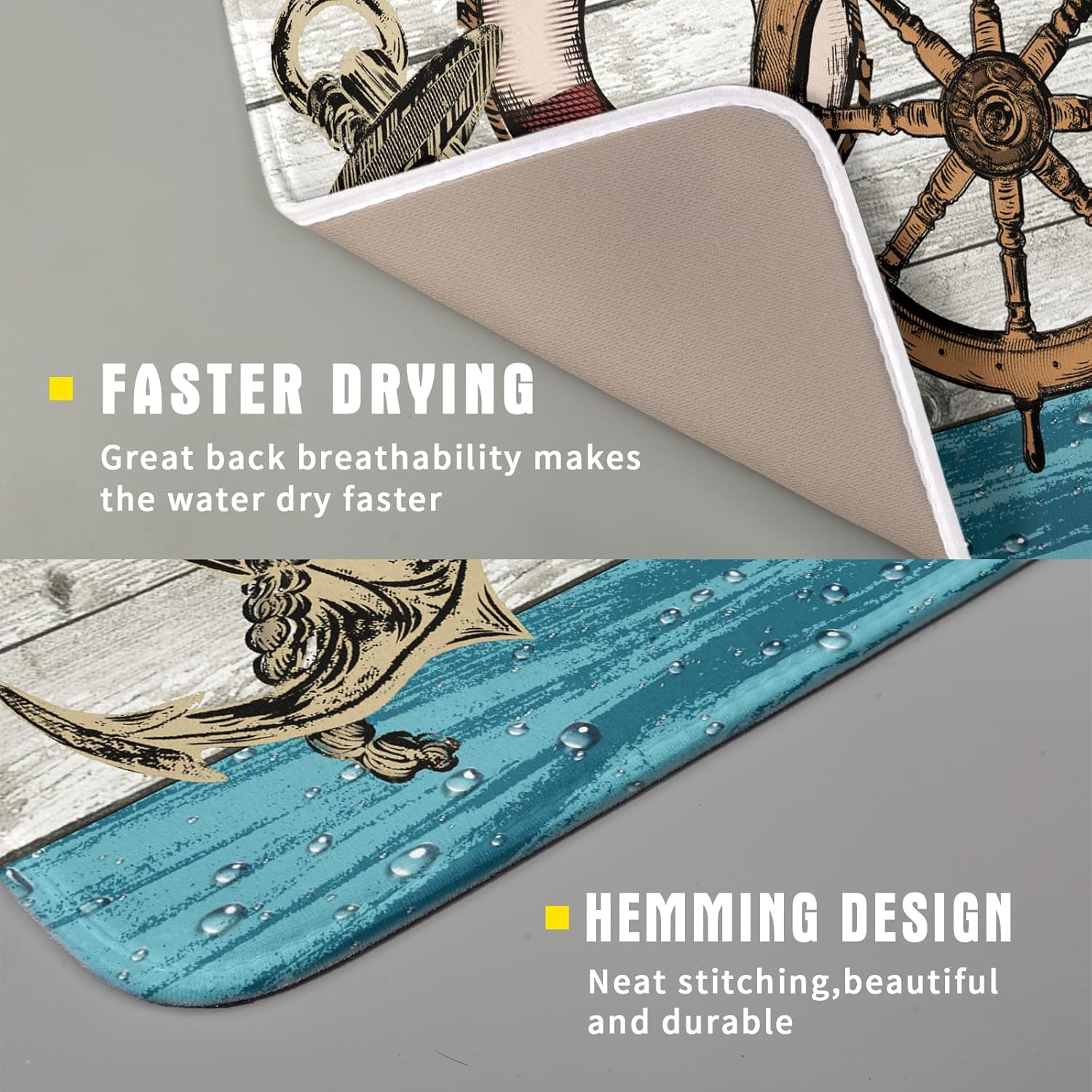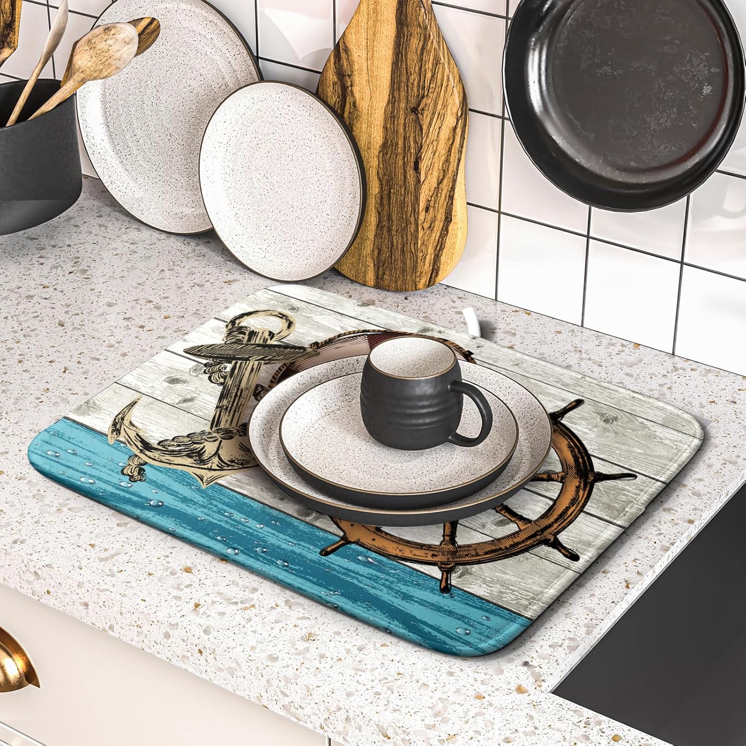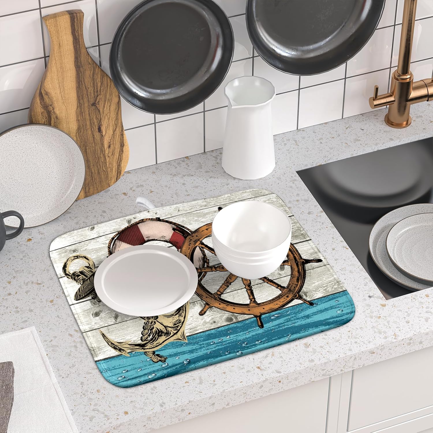 Nautical Anchor Dish Drying Mat 16x18 inch Coastal Boat Fast Dry Microfiber Reversible Dish Drainer Pad Kitchen Countertop Tabletop Decor
