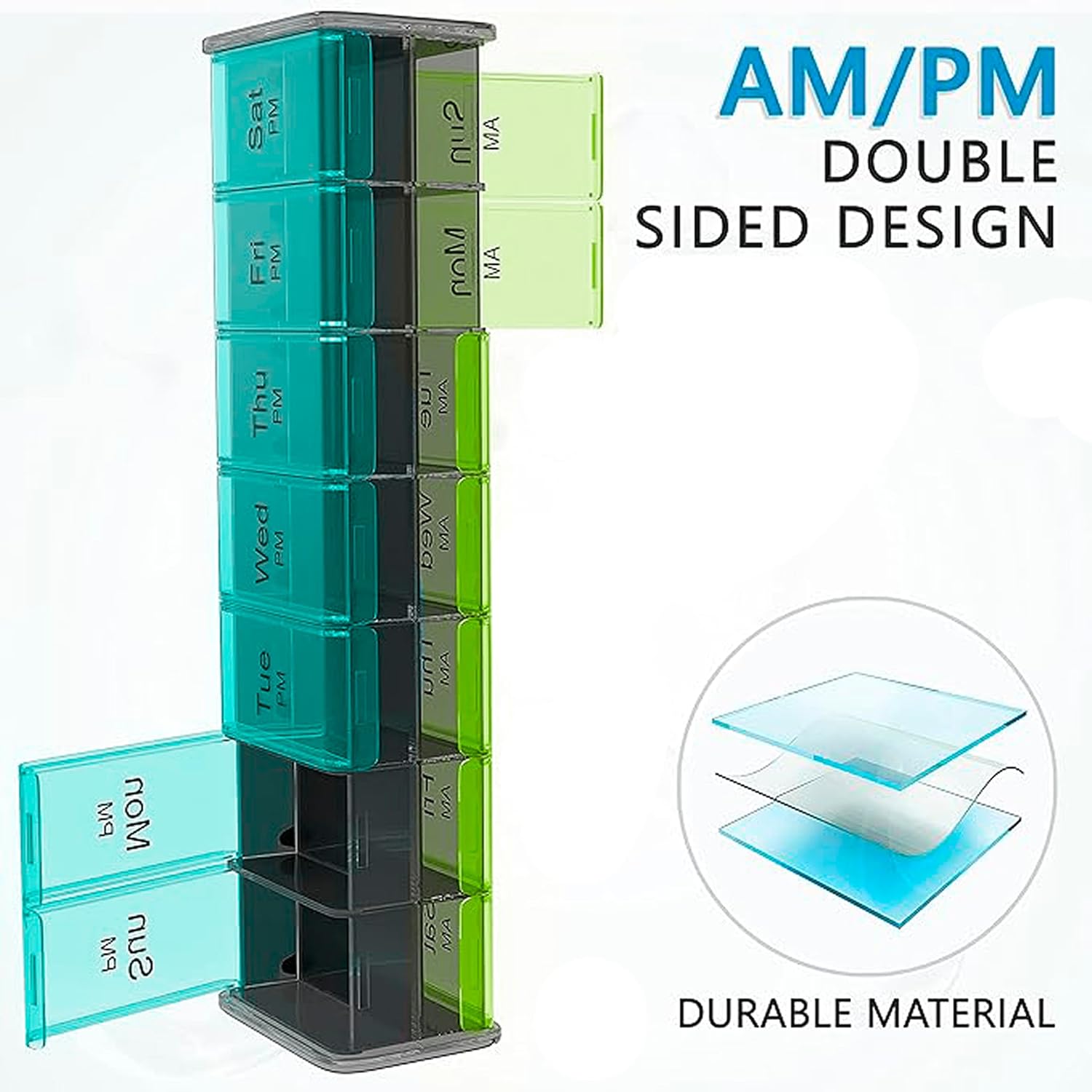 - Dual-Color Design β This weekly medicine pill organizer 2 times a day features a practical green and blue color split, simplifying pill organization. Large, clear labels on each compartment ensure effortless medication management throughout the week