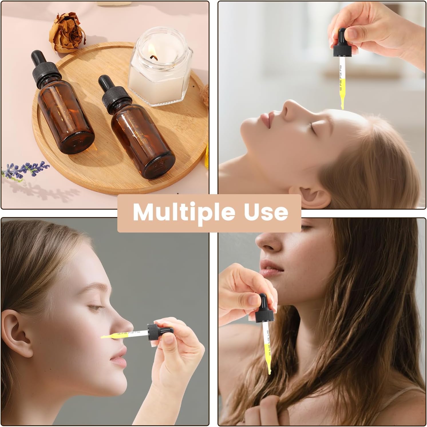 - CALIBRATED DROPPERS: Black polypropylene droppers with glass pipette graduated at .25 ml, .5 ml, .75 ml and 1.0 ml and plastic pipette graduated at 1 ml, 2 ml,3 ml are included in this 1 oz dropper bottles glass set