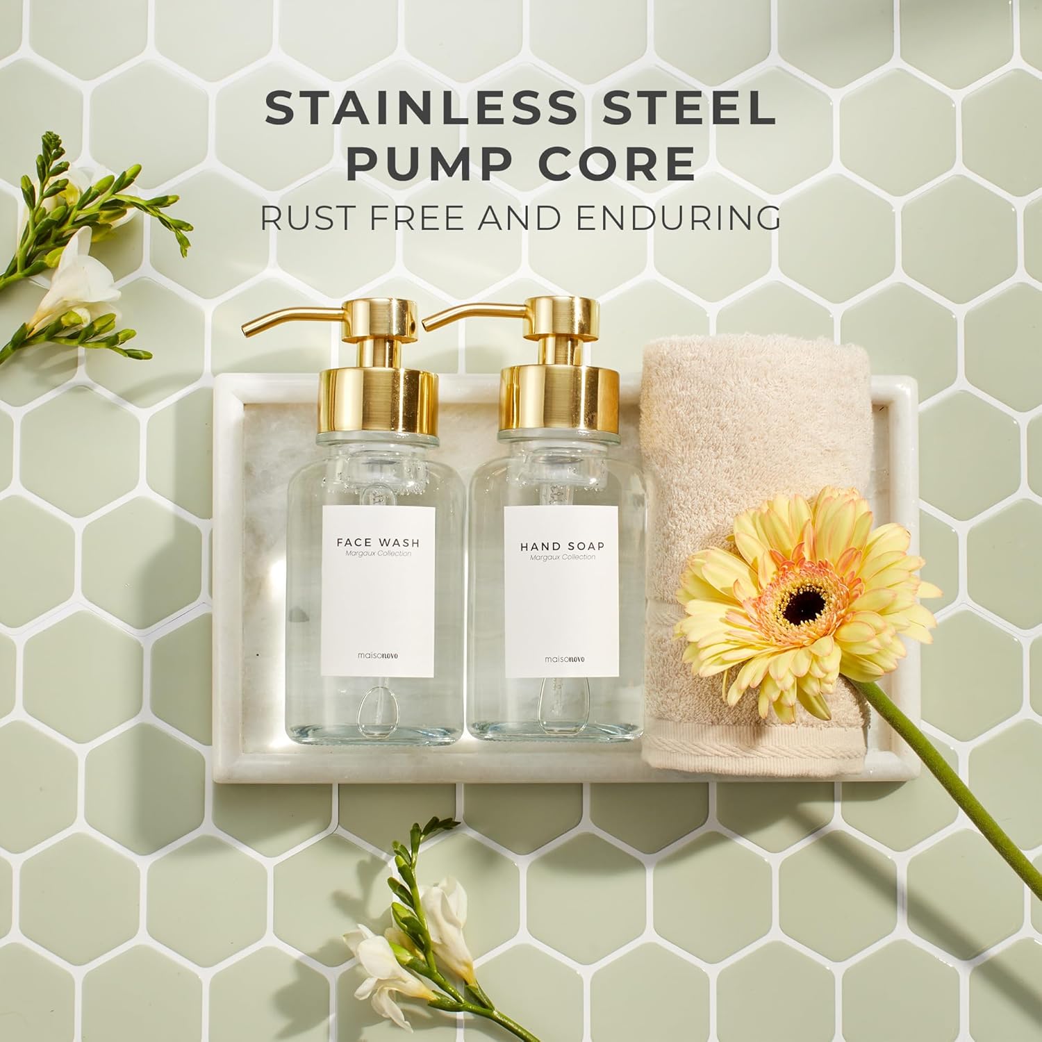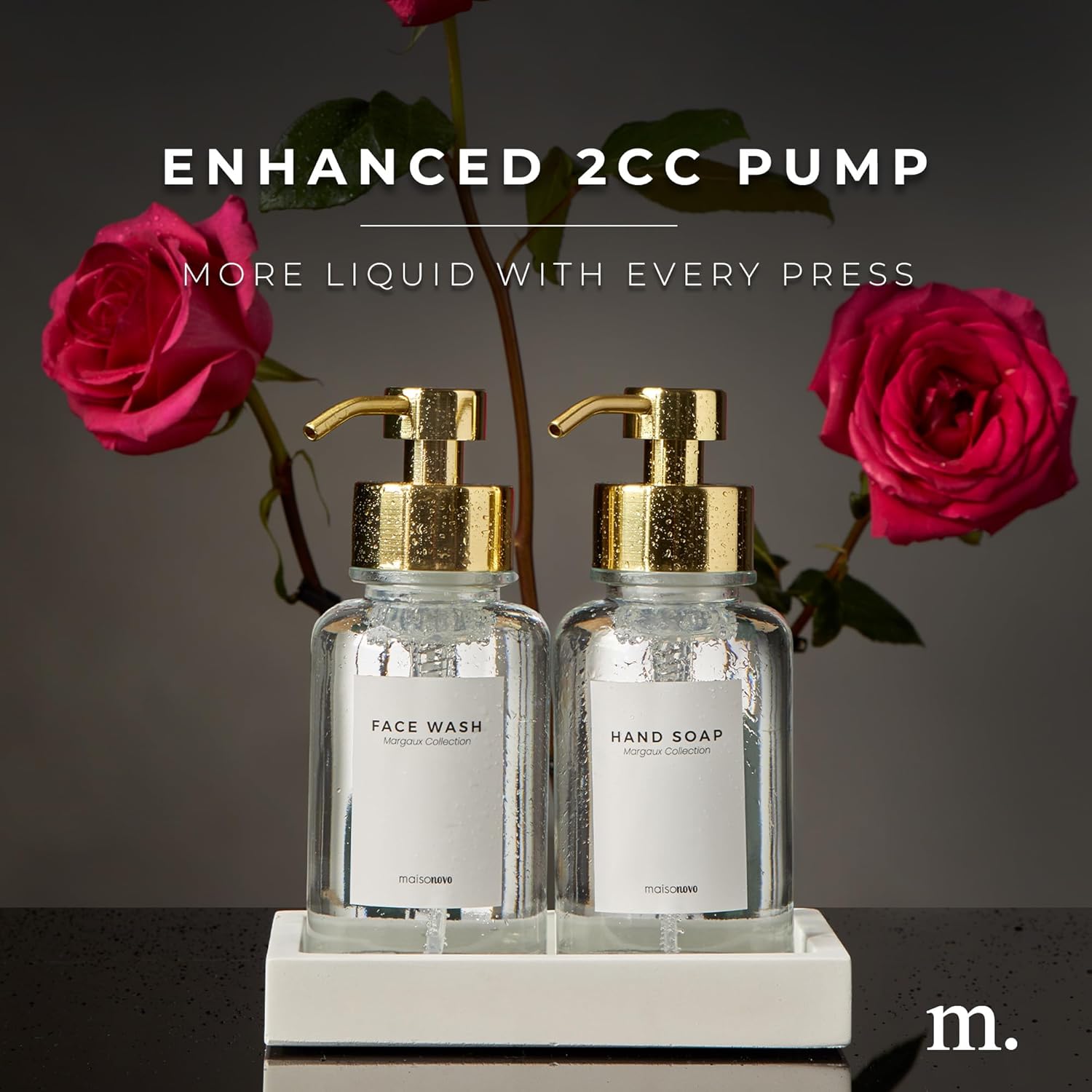 - This Set Includes: The MaisoNovo glass foam pump bottle set includes: two (2) 14oz foaming dispensers, one (1) hand-made concrete tray, and four (4) waterproof face wash and hand soap labels.