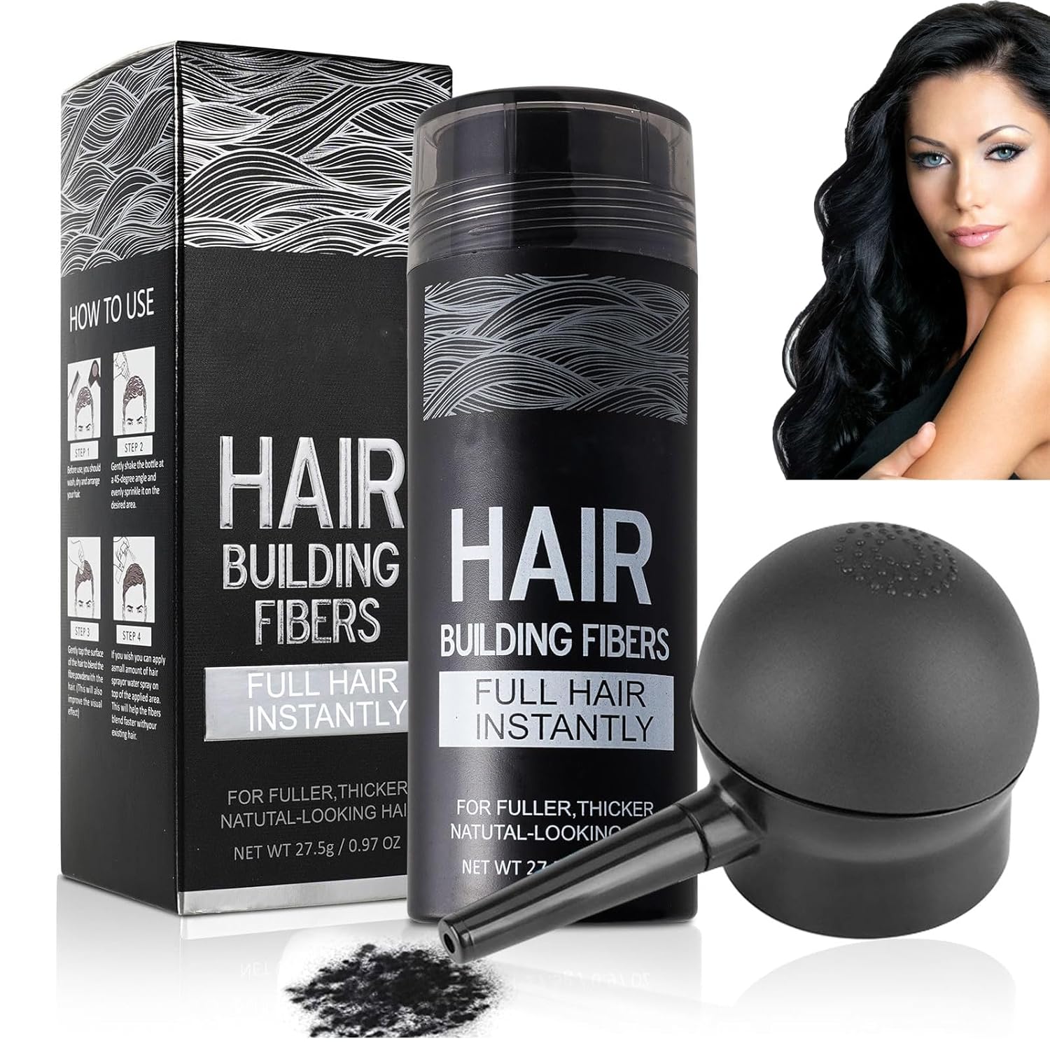 - Hair Fibers with Spray Applicator:Hair building fibers designed to precisely and easily apply hair fibers to thinning areas to instantly cover bald spots, thinning, and patchiness across your temples, crown, and sides.