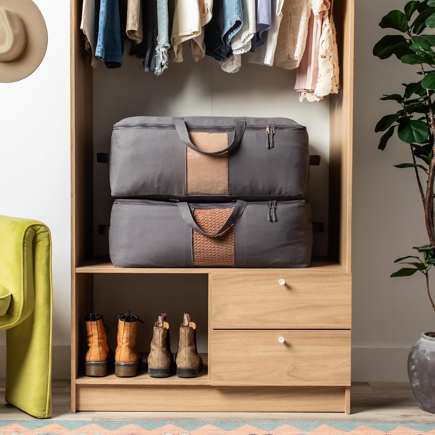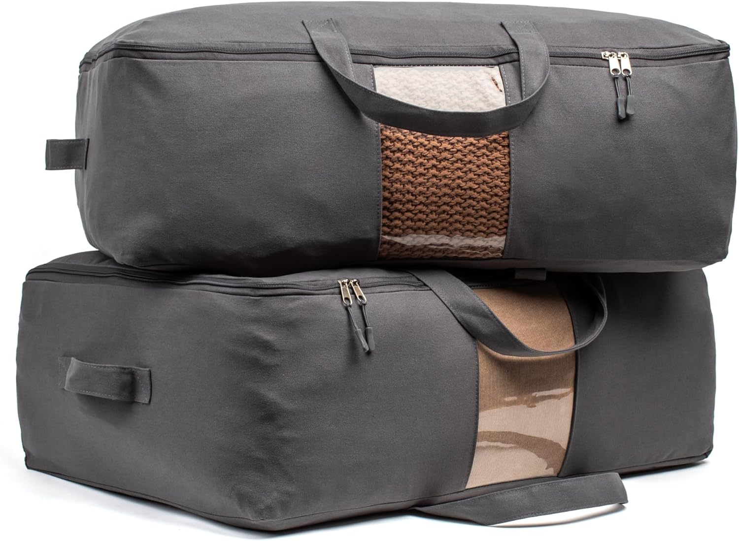 Soft Canvas Storage Bags with Zipper. Thick Breathable, 2pc King/Queen Comforter Organizer. Four Carrying Handles and Window. Large 25x19x9in Bag for Sheets Blankets Bedding Pillows, Clothes (Grey)