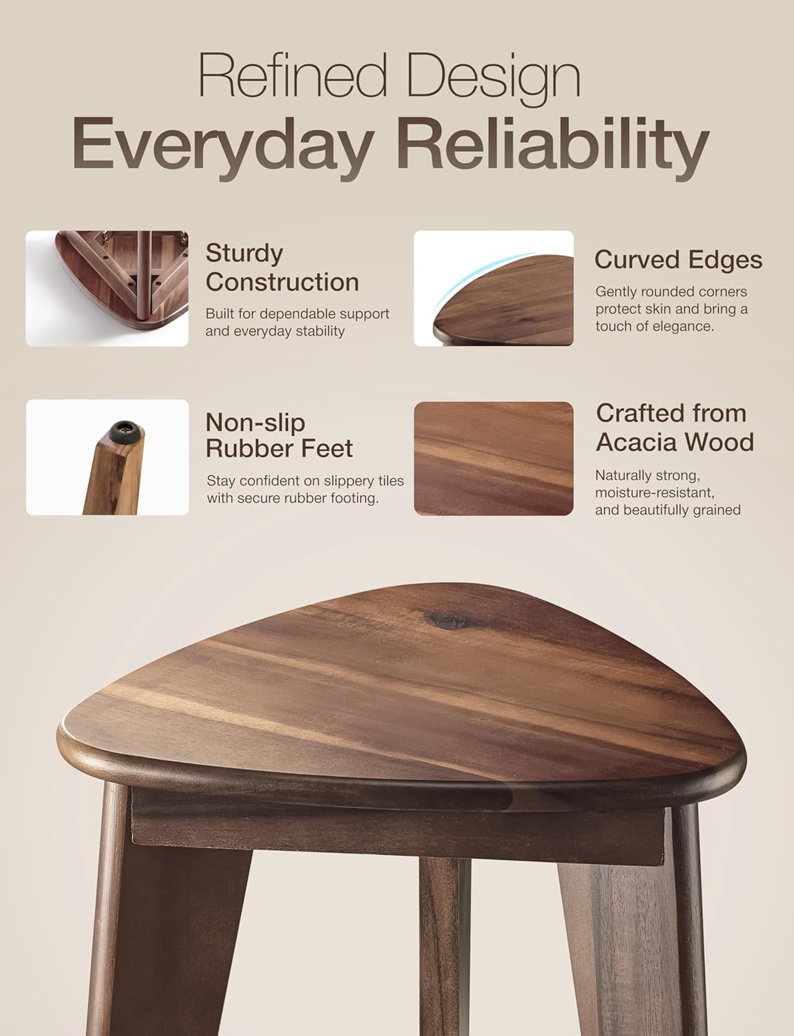 - Crafted from Premium Acacia Wood: This wood shower stool is made from solid Acacia wood with a smooth walnut-toned finish, offering a clean and natural look. Its rich grain and water-resistant properties make it the ideal choice for humid environments like the bathroom or spa