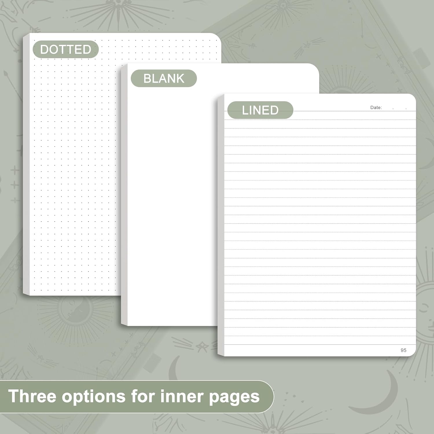 - Hardcover Design: The durable leather notebook with waterproof leather protects pages from wear. The A5 dotted journal cover is embossed with the sun and moon, adding sophistication and elegance. Measuring 5.75 in x 8.38 in, it effortlessly slips into backpacks.
