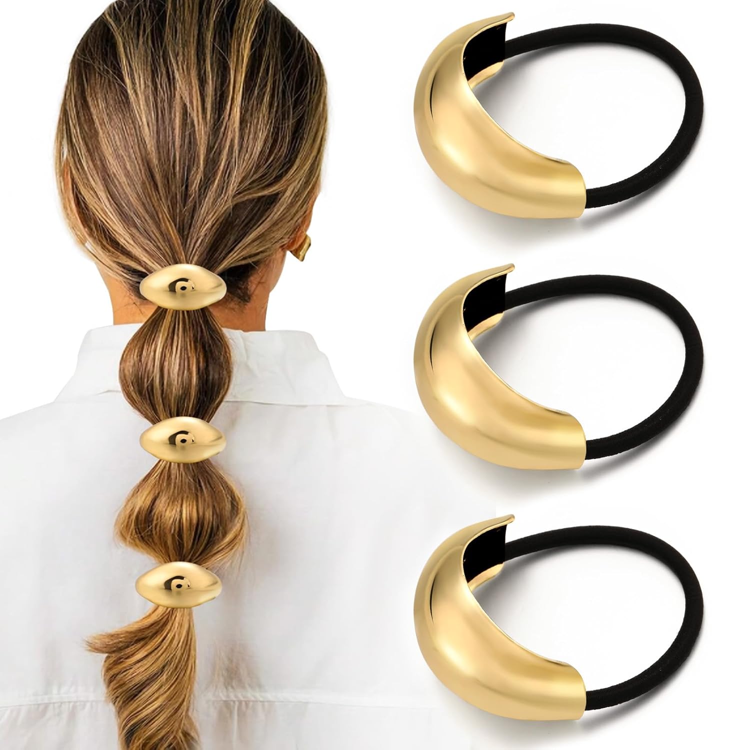 3PCS Gold Hair Ties, Metal Hair Ties for Thick Hair, Elegant Durable Geometric Design Hair Cuffs, Gold Hair Accessories Stretchy Non-Damage Ponytail Cuff Holders Holiday Gifts