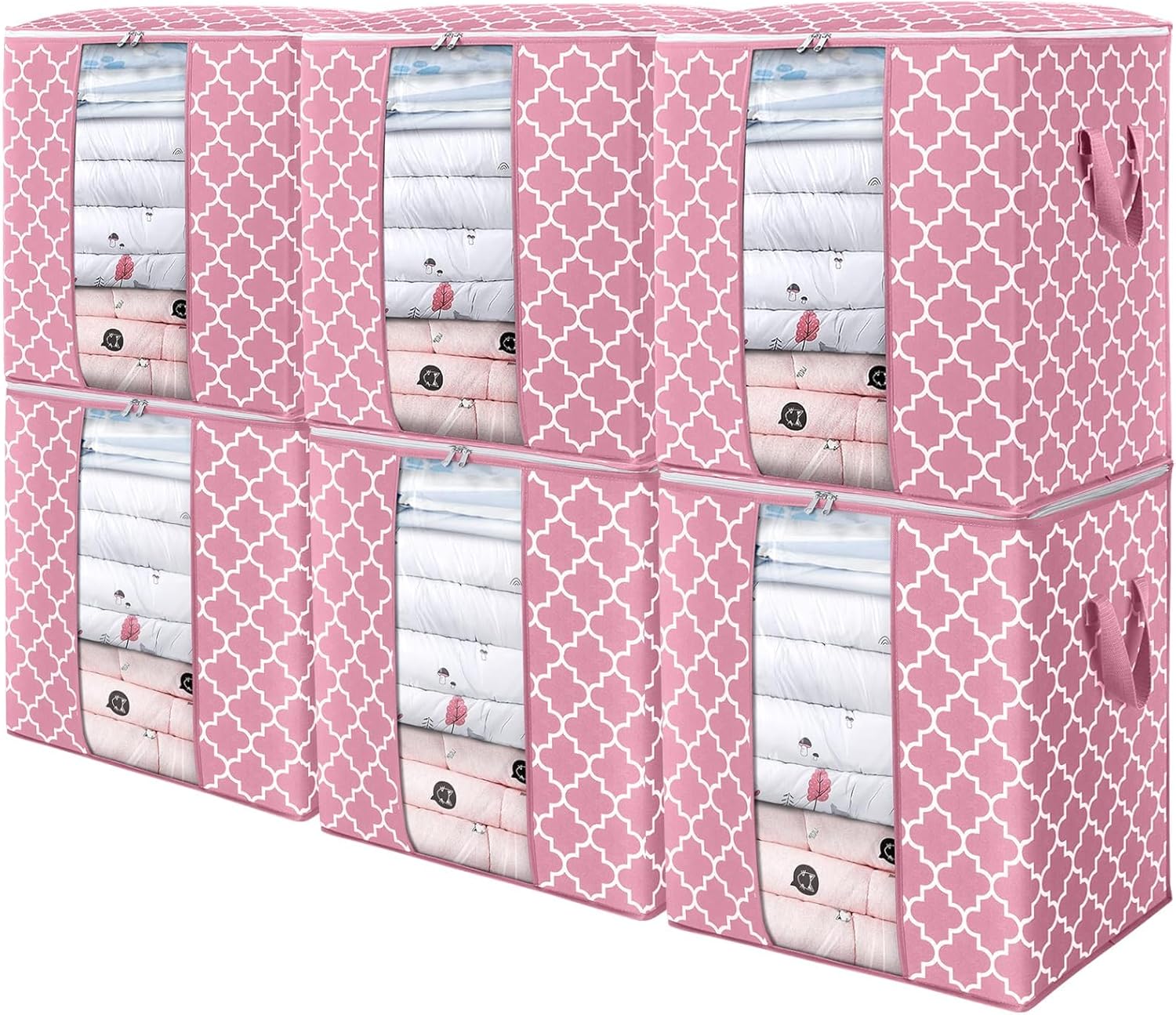WISELIFE Storage Bags 6 Pack/100L Large Blanket Clothes Organization and Storage Containers for Comforters,Bedding, Foldable Organizer with Reinforced Handle, Clear Window, Sturdy Zippers,Pink