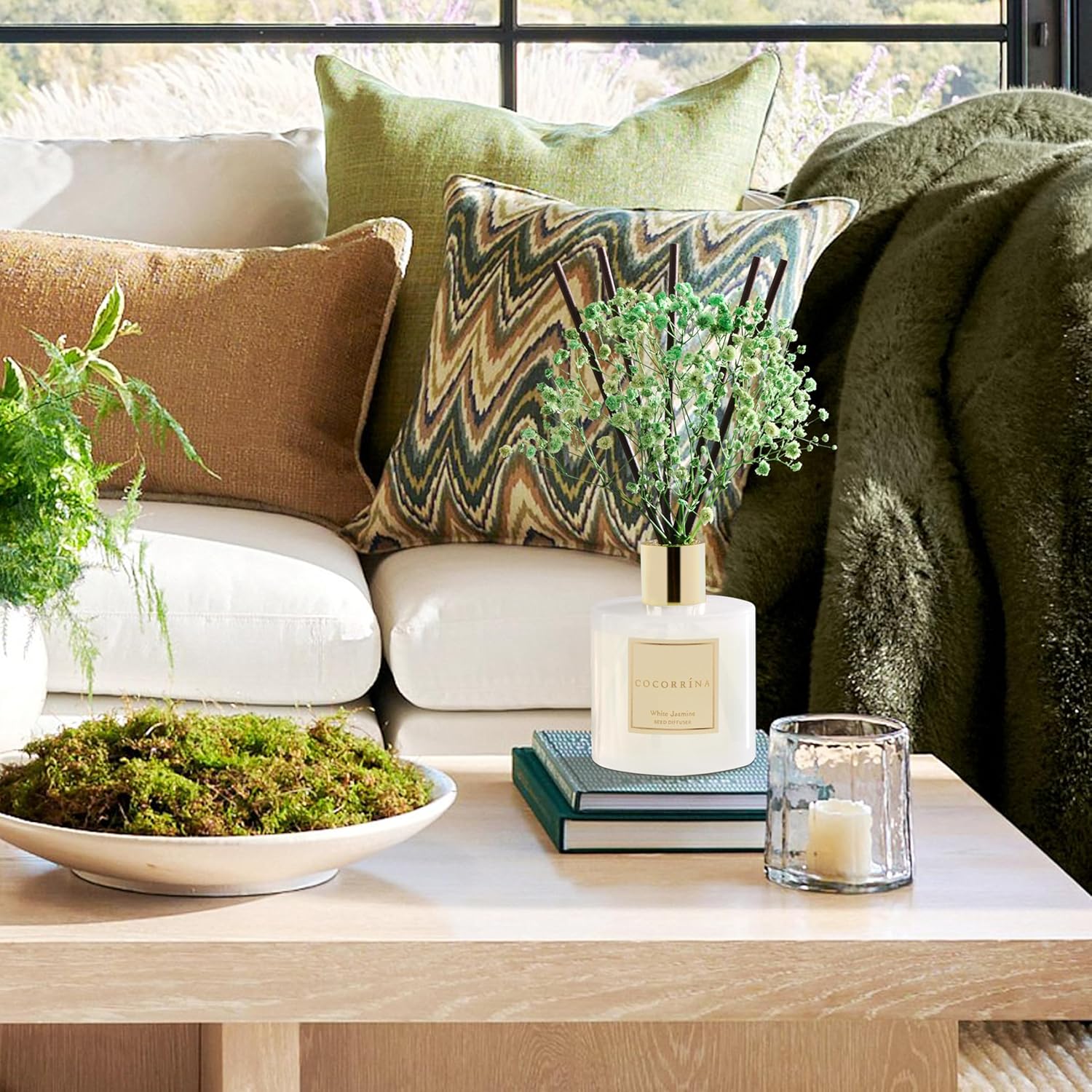 COCORRÍNA Reed Diffuser - White Jasmine 6.7 Fl.oz Reed Diffuser Set with Sticks & Preserved Baby's Breath, Reed Diffuser for Home Bathroom Shelf Decor