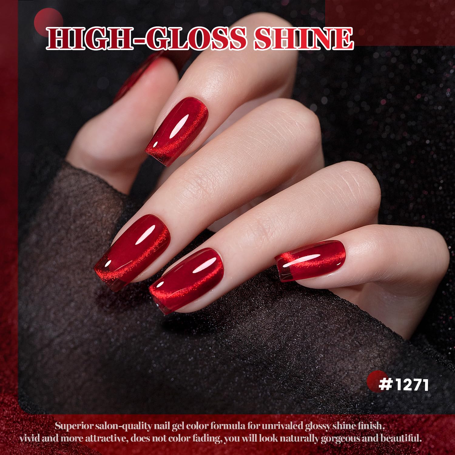 - RED CAT EYE EFFECT:These six smooth ceramics glitter cat eye gel nail polish colors feature a red color tone, soft glow with a gradient transition from bright red to delicate burgundy .Made with magnetic shimmers and silver pigments, our new shades create optical nail-lusions that move with every angle