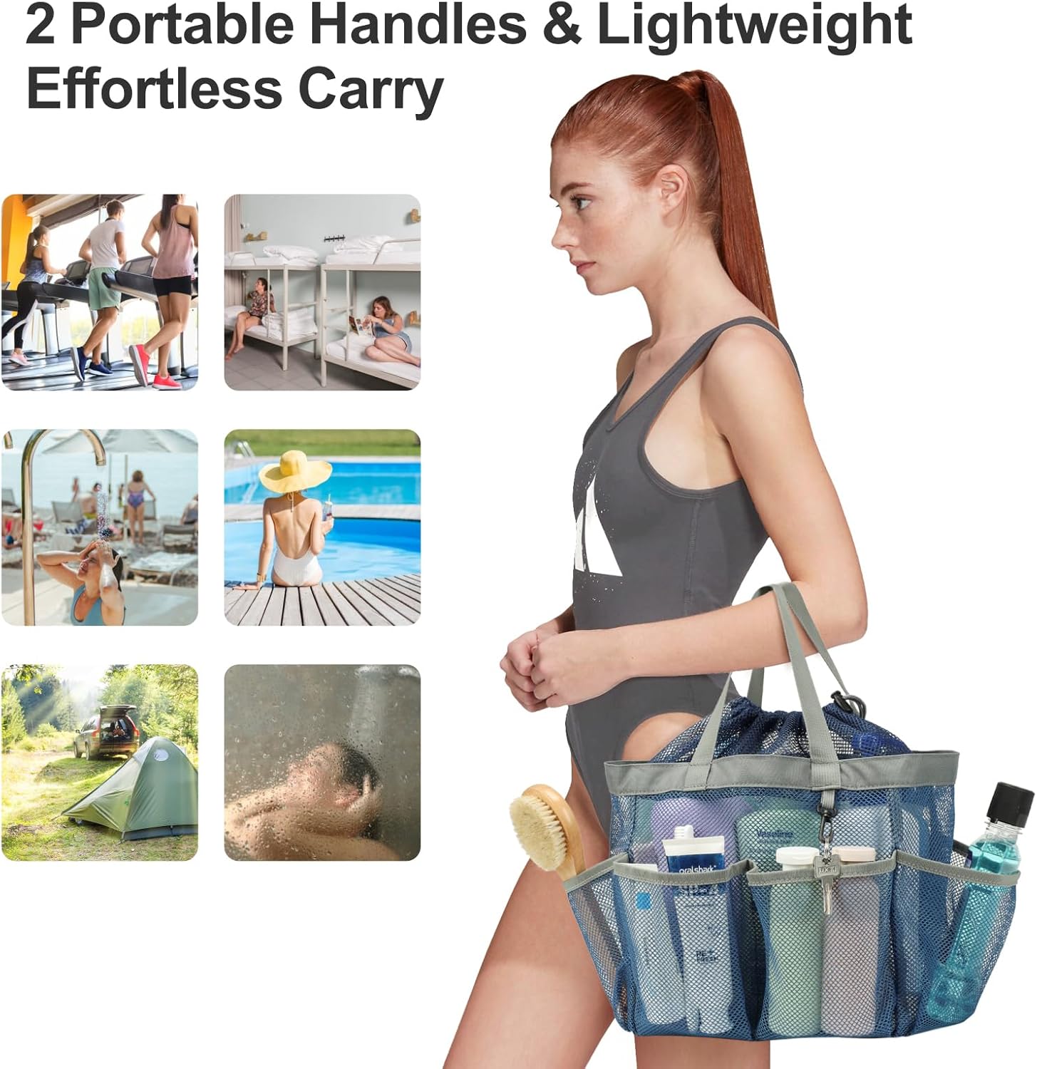 - 7 Upgraded Deep Pockets & Secure Drawstring for Peace of Mind: This shower tote bag features 7 upgraded exterior pockets with 7-inch depth, keeping tall bottles upright to prevent spills. A secure drawstring closure ensures toiletries stay safely inside—no more spills or lost items while you’re on the move