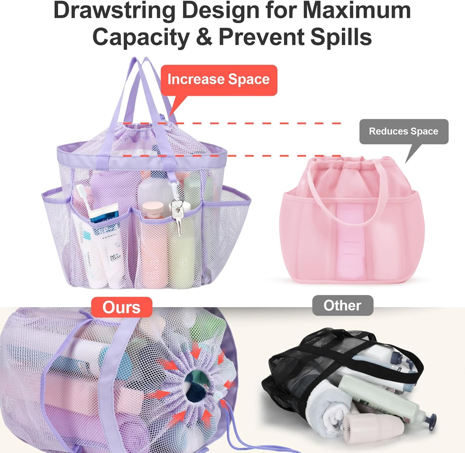 - 7 Upgraded Deep Pockets & Secure Drawstring for Peace of Mind: This shower tote bag features 7 upgraded exterior pockets with 7-inch depth, keeping tall bottles upright to prevent spills. A secure drawstring closure ensures toiletries stay safely inside—no more spills or lost items while you’re on the move