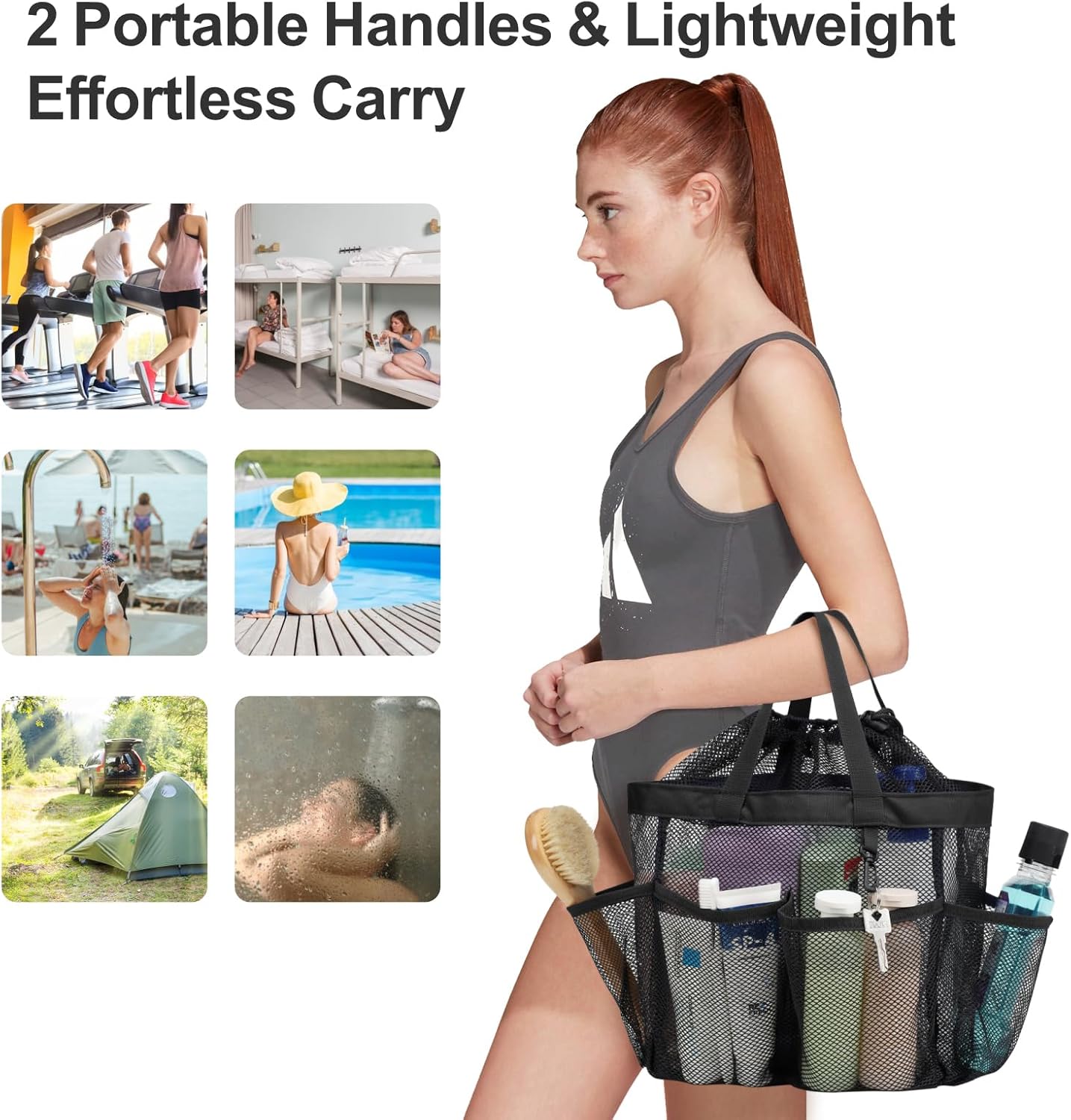 - 7 Upgraded Deep Pockets & Secure Drawstring for Peace of Mind: This shower tote bag features 7 upgraded exterior pockets with 7-inch depth, keeping tall bottles upright to prevent spills. A secure drawstring closure ensures toiletries stay safely inside—no more spills or lost items while you’re on the move