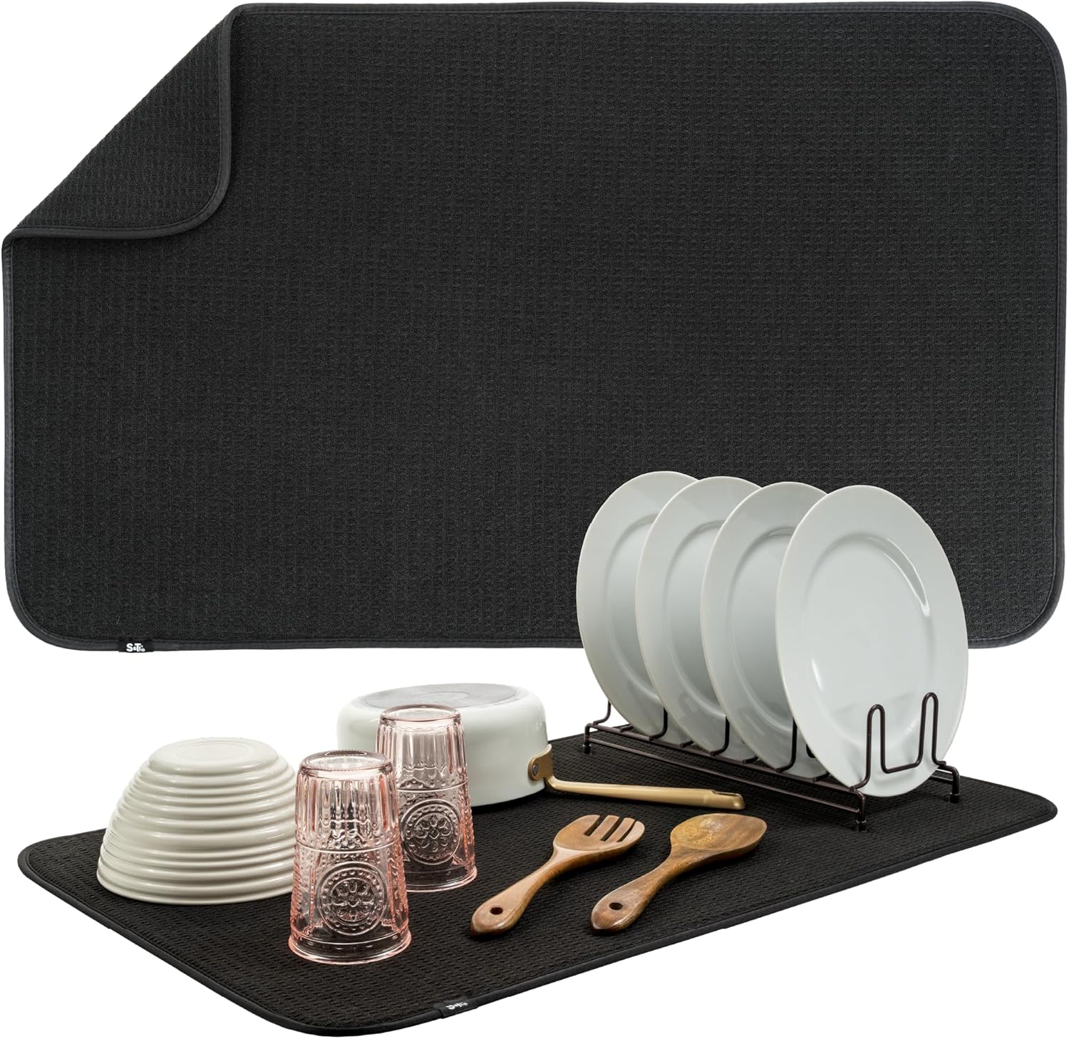 S&T INC. Dish Drying Mat Jumbo, 18” x 30”, Absorbent Microfiber Kitchen Counter Mat, Dish Drying Pad for Dishes, Utensils, Pots and Pans, Jumbo, Black