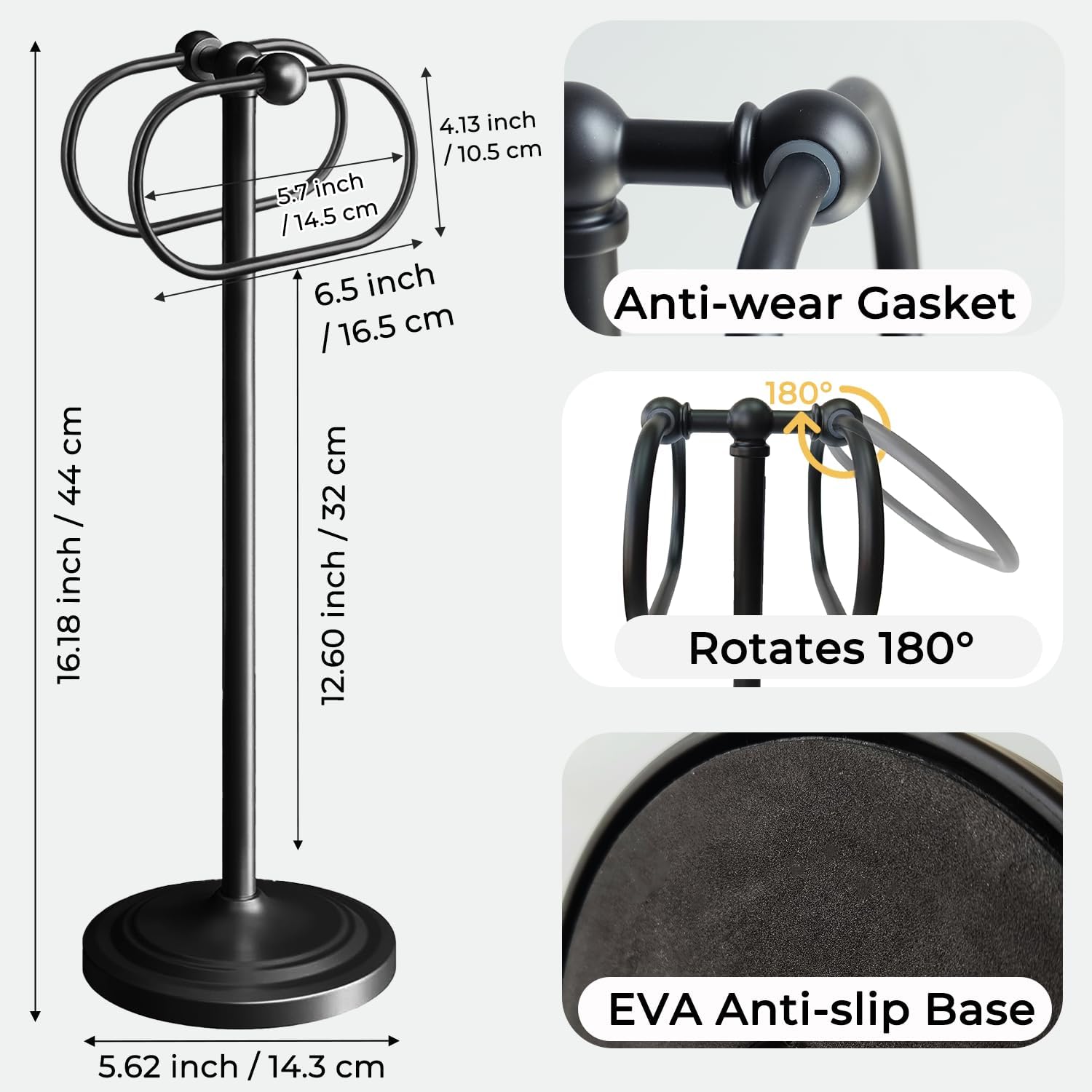 - Space-Saving Design: Standing at 17.2 inch/44.2cm tall with a 5.60-inch/14.3cm base, this compact hand towel holder fits perfectly on countertops in bathrooms, kitchens, or other areas without occupying too much room.