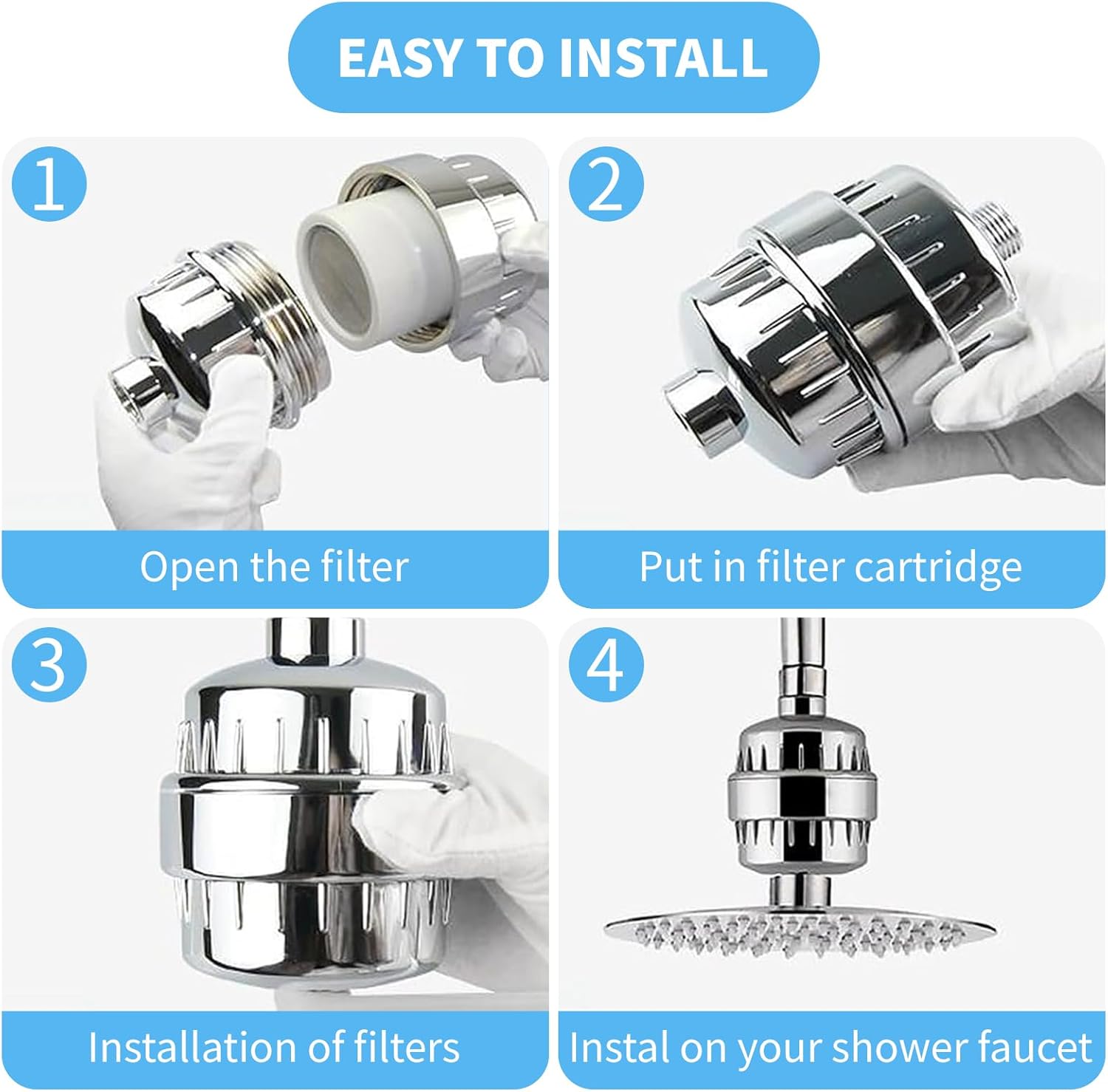 - 【Easy to install】Say goodbye to cumbersome procedures or tools. Simply open the shower head water filter, remove the used shower filter cartridge, put in a new one, and the water flow will return to normal in seconds. Please pay attention to the installation direction.