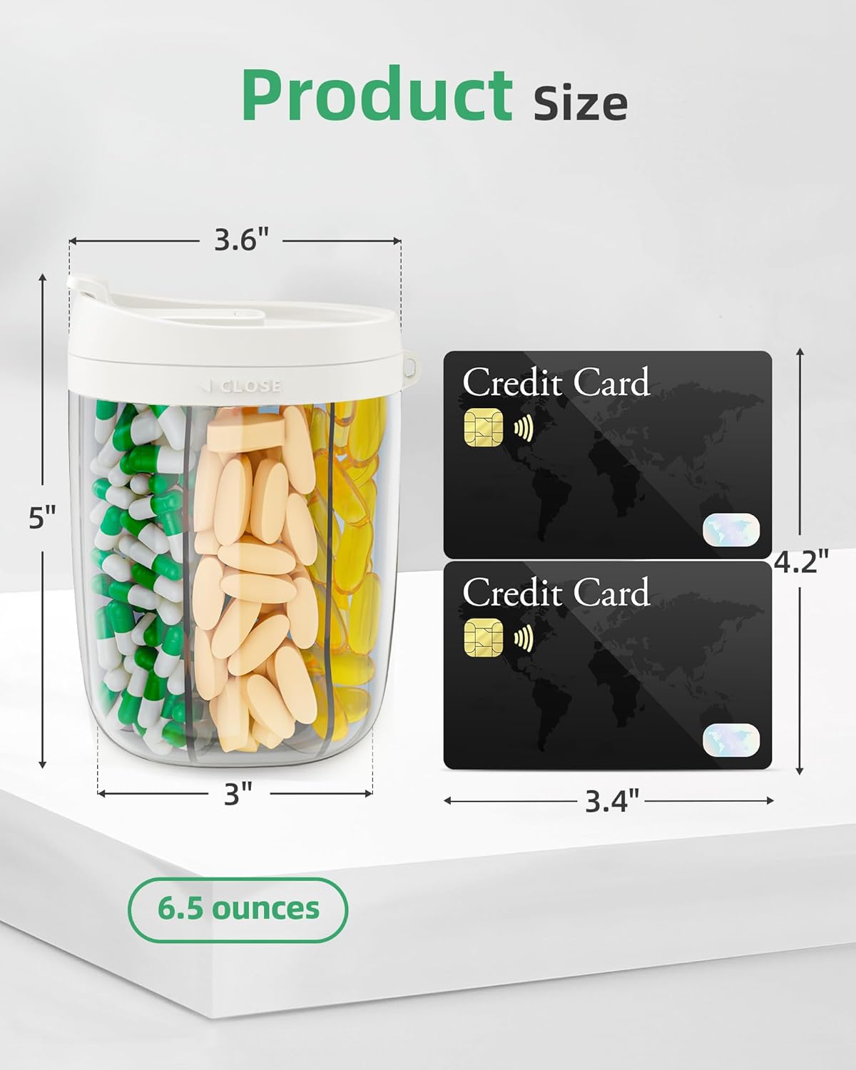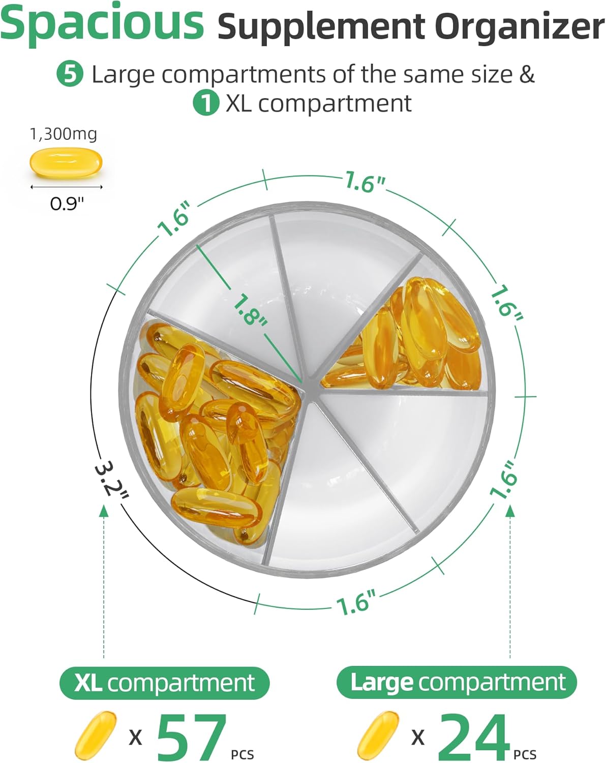 - Large Compartments: The PULIV pill holder weighs 6.5 ounces and features 1 XL compartment and 5 large compartments. The XL compartment can hold up to 57 fish oils, with each fish oil measuring 0.9" in length, while each of the large compartments can store 24 fish oils. This pill dispenser offers a convenient way to store 6 types of pills in one place. It has a height of 5.0" with a lid diameter of 3.6" and a base diameter of 3.0". And 20 stick-on labels can help differentiate each compartment