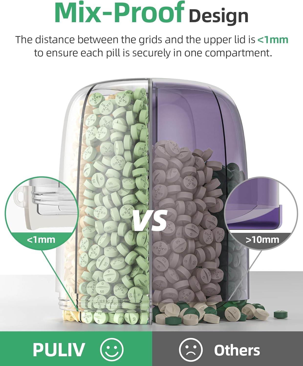 - Say Goodbye to Mixing Pills: PULIV jumbo medication organizer with the design that the distance between the grids and the upper lid is close to ensure anti-mixing pills. Stop being troubled by pills mixing when pouring. Please note: This organizer is not suitable for storing gummy vitamins. For optimal use, store in a dry place and avoid direct sunlight exposure