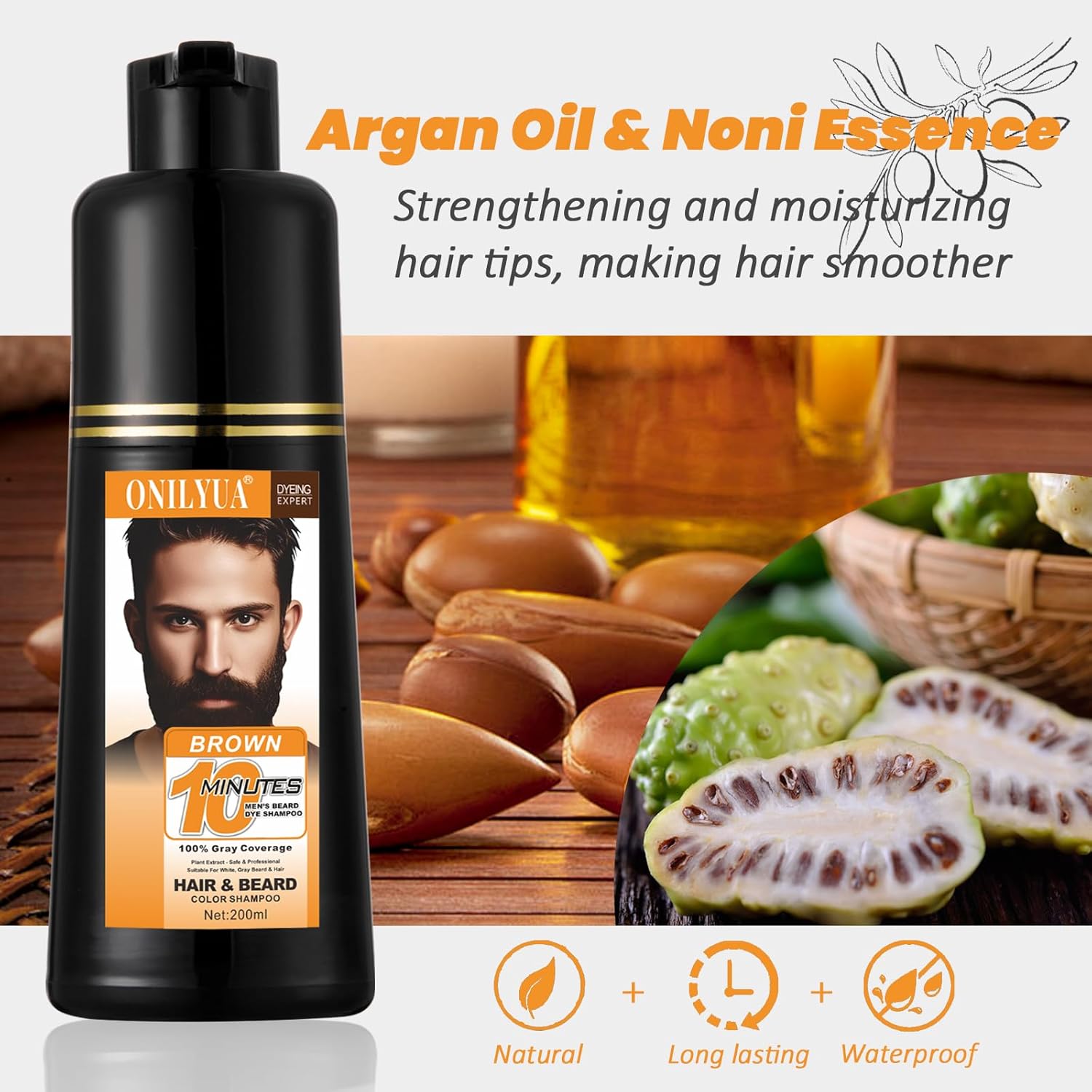 - DYE WITHOUT DAMAGE: Unlike traditional hair dye shampoos that leave your hair colored at the cost of dry, dull & frizzy hairs, Our beard dye formula just for men's hair color contains argan oil and noni essences without harsh chemicals that can damage your hair, giving you a natural-looking results that never look fake.