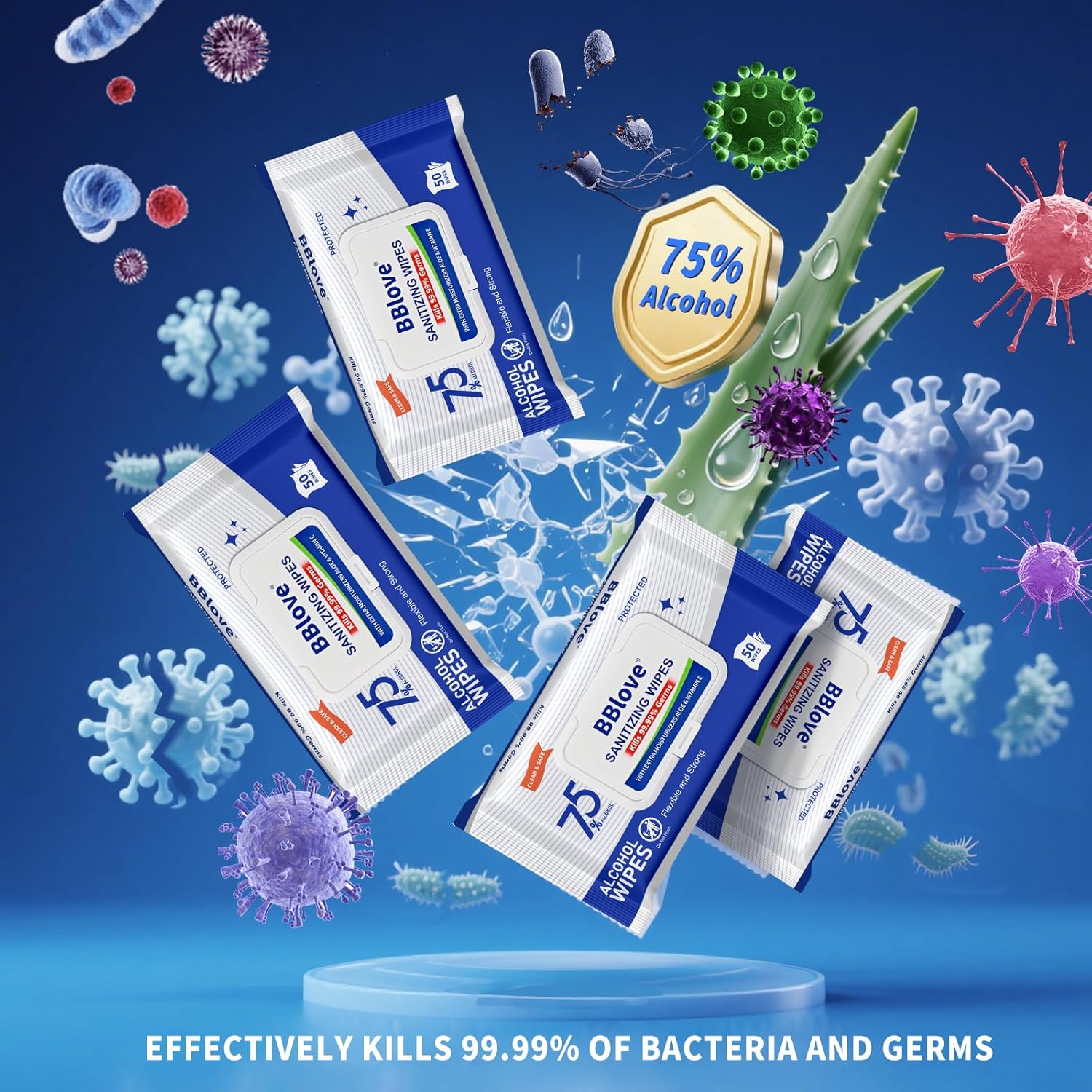 75% Alcohol Unscented Sanitizer Wipes, Moisturizing Hand Sanitizing Wet Wipes with Aloe Vera, 200-Count Bulk Pack with Travel-Friendly Design, 50 Count x 4 Packs