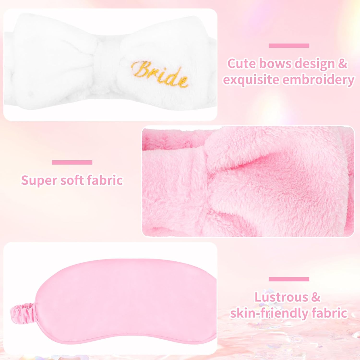 - Bachelorette & Bridesmaid Must-Haves: Includes 1 gold-embroidered “Bride” headband + 1 matching eye mask; 5 pink bow headbands + 6 matching eye masks—perfect for bachelorette party favors, bridesmaid proposal gifts, or bridal shower favors. A full set to match your squad’s style!