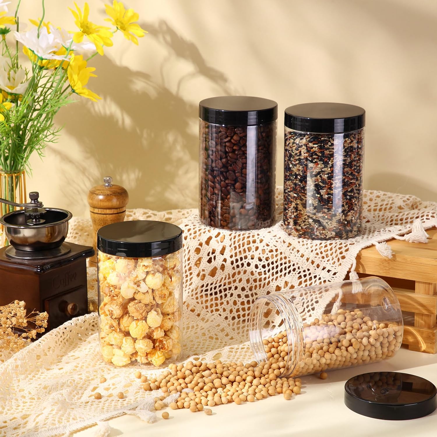- What you receive: there are 4 pieces plastic jars with black screw-on lids. They are reliable and refillable, measuring about 27 oz in capacity