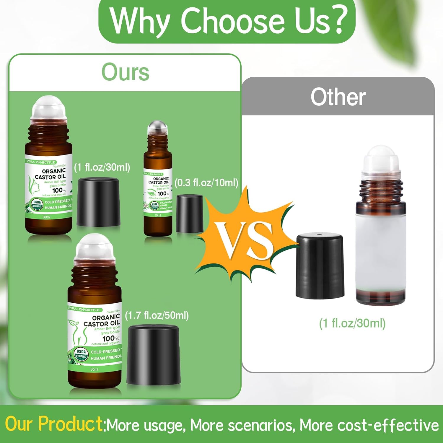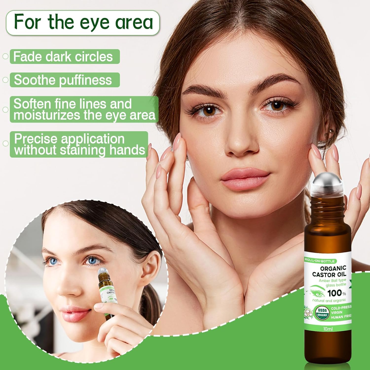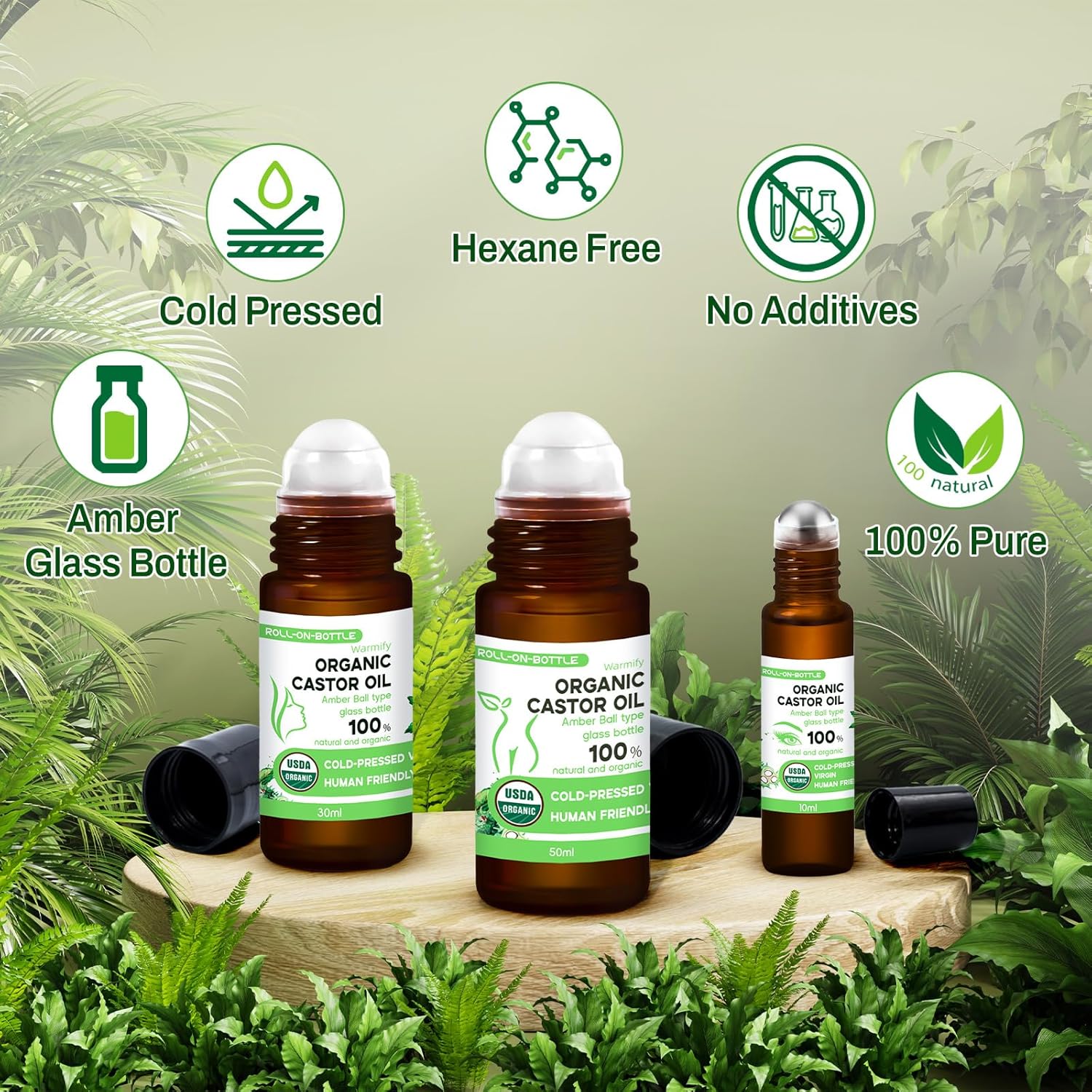 - USDA CERTIFIED ORGANIC CASTOR OIL - Our roll on castor oil Made from pure,natural organic ingredients, cold-pressed and hexane-free to retain nutrients. Stored in UV-protective amber glass bottles for long-lasting freshness and application to eye,belly face, and body.