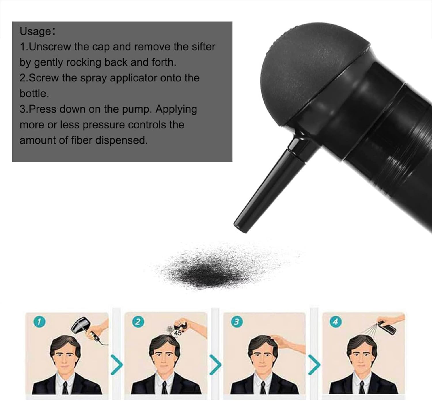 - How to Use: Align the nozzle with the fibre holes of the fibre powder bottle and install, then point the nozzle towards the area of the hair where the fibre powder needs to be attached. Press the silicone pump with your thumb and the fibre powder will spray out