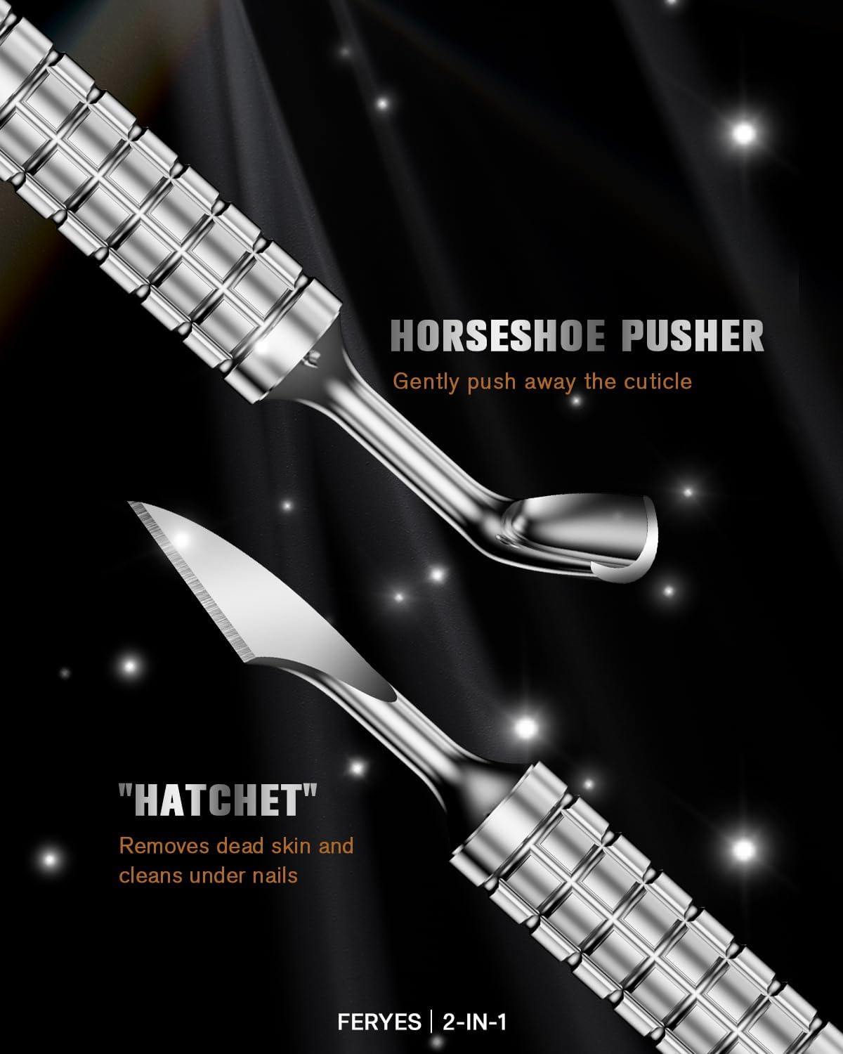 - 【Dual Heads for Surgical-Grade Precision】Engineered with a innovative Horseshoe Edge pusher and chisel edge – Achieve salon-level results by gently pushing cuticles without tearing, while the 1.5mm Chisel Edge effortlessly scrapes off gel polish, calluses, and dead skin. No more switching between 2 tools!