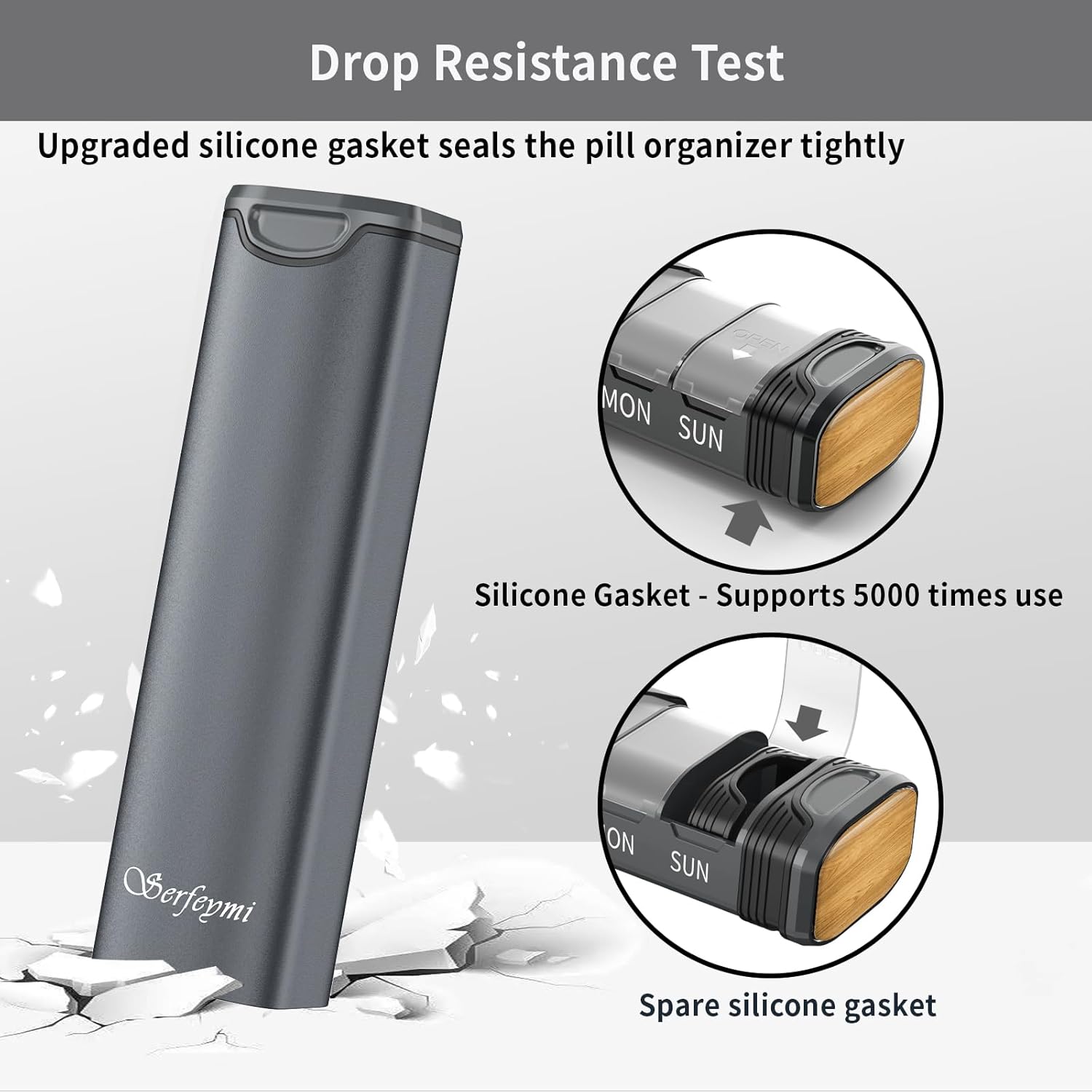 Metal Weekly Pill Organizer, Serfeymi Aluminum Daily Pill Box(Spare Gasket Provided),7 Day Pill Case Travel Medicine Organizer,Pill Containers with Individual Lid for Vitamins,Pills, Supplement-Gray