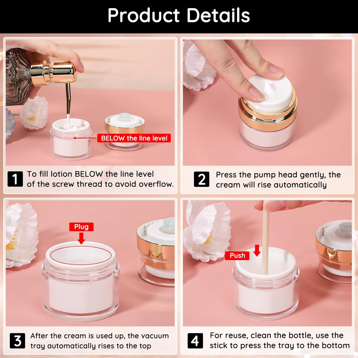 - Reusable & Every Drop for Less Waste: These airless bottles can be cleaned easily and reused when product is used up. The vacuum pump ensures every last drop is dispensed for less waste, which can fully utilize your skincare product