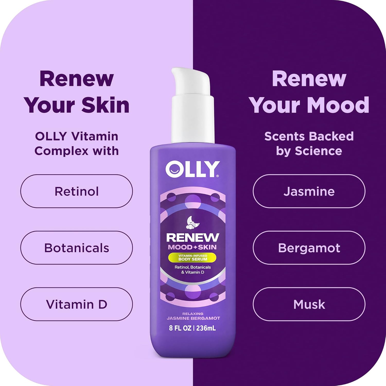 - Renew Your Skin + Mood: OLLY RENEW MOOD + SKIN Body Serum is scientifically formulated to repair your skin barrier overnight, while mood-transforming fragrances are proven to help you prep for bed.
