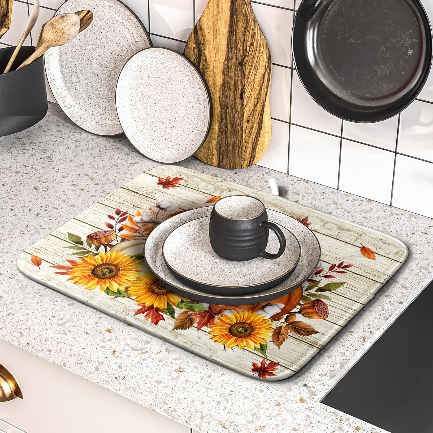 Hello Fall Dish Drying Mat Autumn Pumpkin Dish Drainer Rack Mats 16"x18" Fast Dry Microfiber Dish Drying Pad for Kitchen Countertop Table