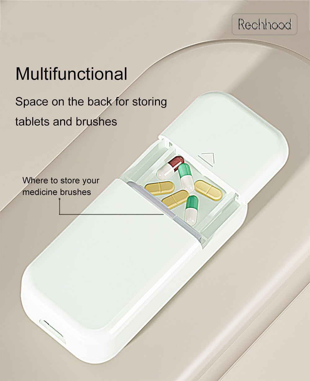 - CONVENIENT CLEANING: There will be a slight powder after the pills are cut, you can use our included cleaning brush to clean the blades, when the pill case is rotated 180 degrees to open, the protective piece will be at the bottom of the blade convenient to clean with a cleaning brush, rinse with water to fix the position of the pills, so that the health is no worries