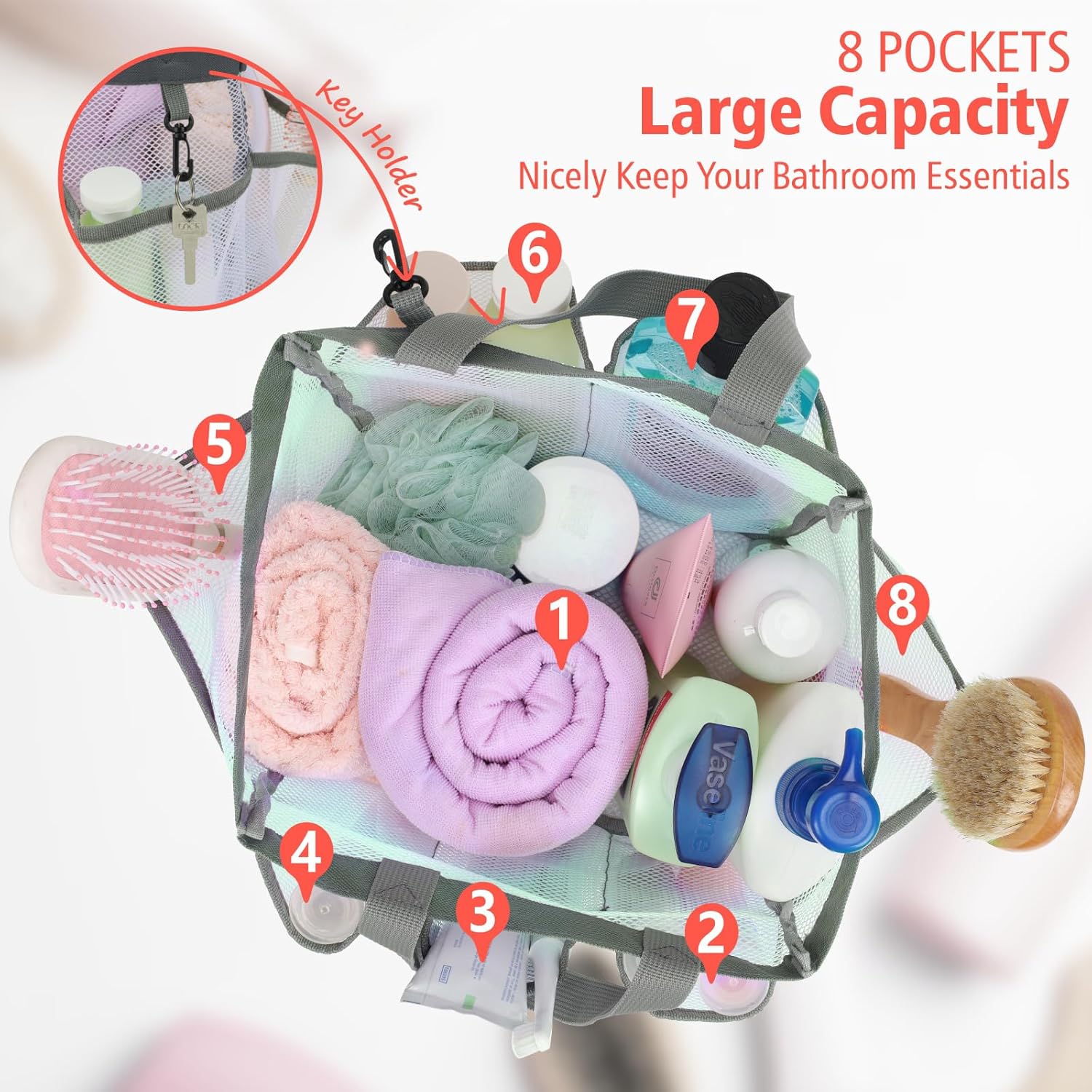 - Spacious & Organized for All Bathroom Essentials: Never worry about running out of room with our extra-large shower caddy dorm measuring 10.2" x 7.9" x 10.6". 7 exterior pockets and a roomy main compartment fit all your essentials like shampoo, conditioner, body wash, lotion, soap, toothbrush, towels, and more; Includes a handy keychain so you’ll always know where your keys are