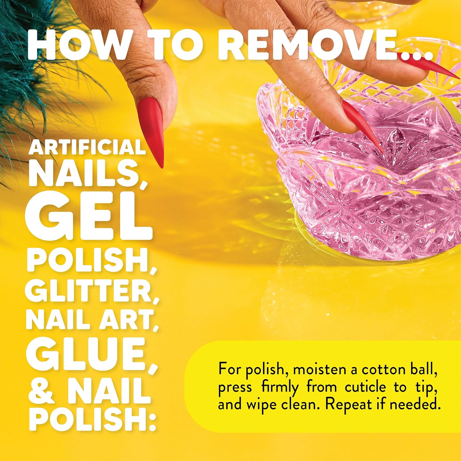 - Directions: Simply clip the artificial nails, and soak your fingers in a bowl of the nail remover for 15 minutes. Gently file down the softened product and soak for another 15. For regular polish, Moisten cotton balls and massage the nail bed