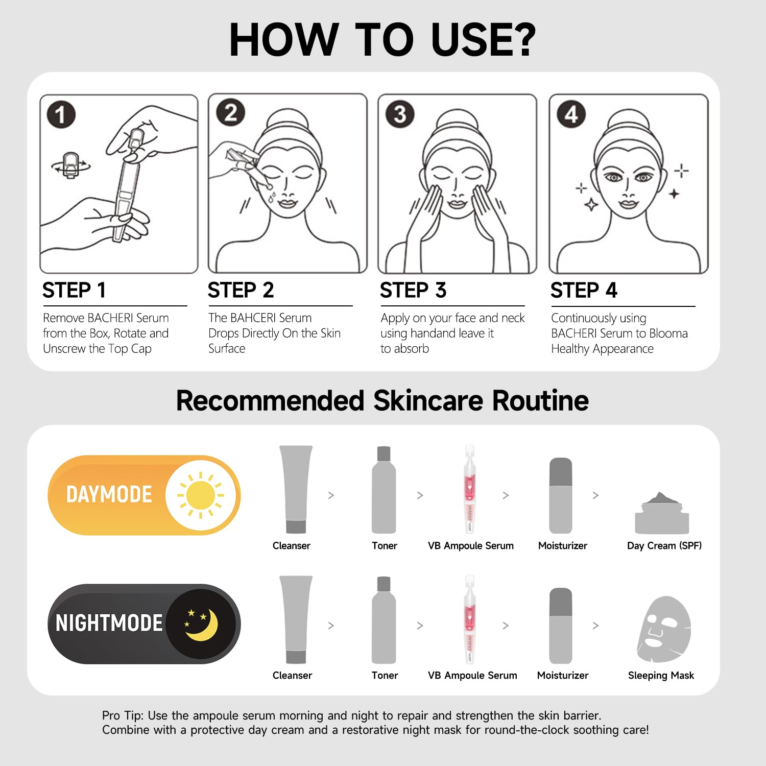 - Convenient BACHERI Ampoules Serums β Each 1.5ml ampoule delivers a hygienic, precisely measured dose, keeping the formula fresh and potent. Perfect for travel or daily use. How to Use: Hold the upper and lower parts of the ampoule, then use two fingers and snap to open.