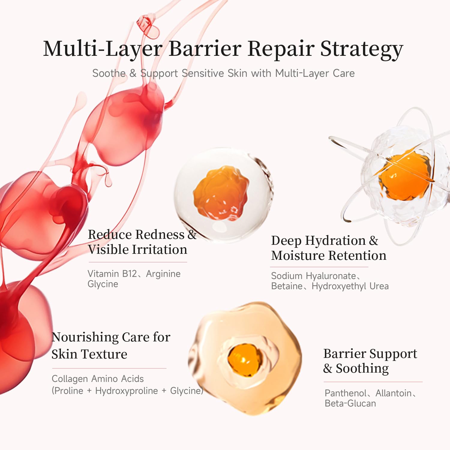 - Targeted Barrier Repair & Redness Relief β Powered by Amino Acids (Arginine, Proline, Hydroxyproline, Glycine) and Vitamin B12, this serum supports weakened skin barrier, helps calm redness, and improves resilience for sensitive skin.