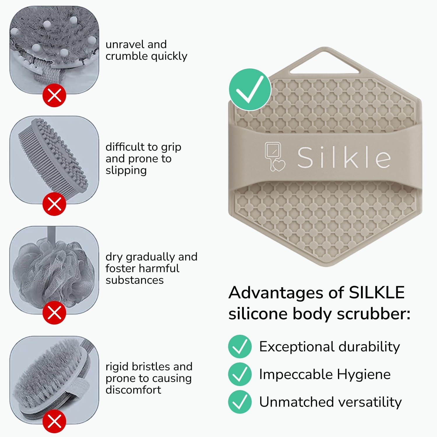 - Durable, reusable & easy to clean: Made from premium 100% silicone that rinses clean in seconds and dries quickly. Keeps its shape use after use and won’t fray like mesh puffs - a more hygienic loofah alternative and long-lasting washcloth replacement.