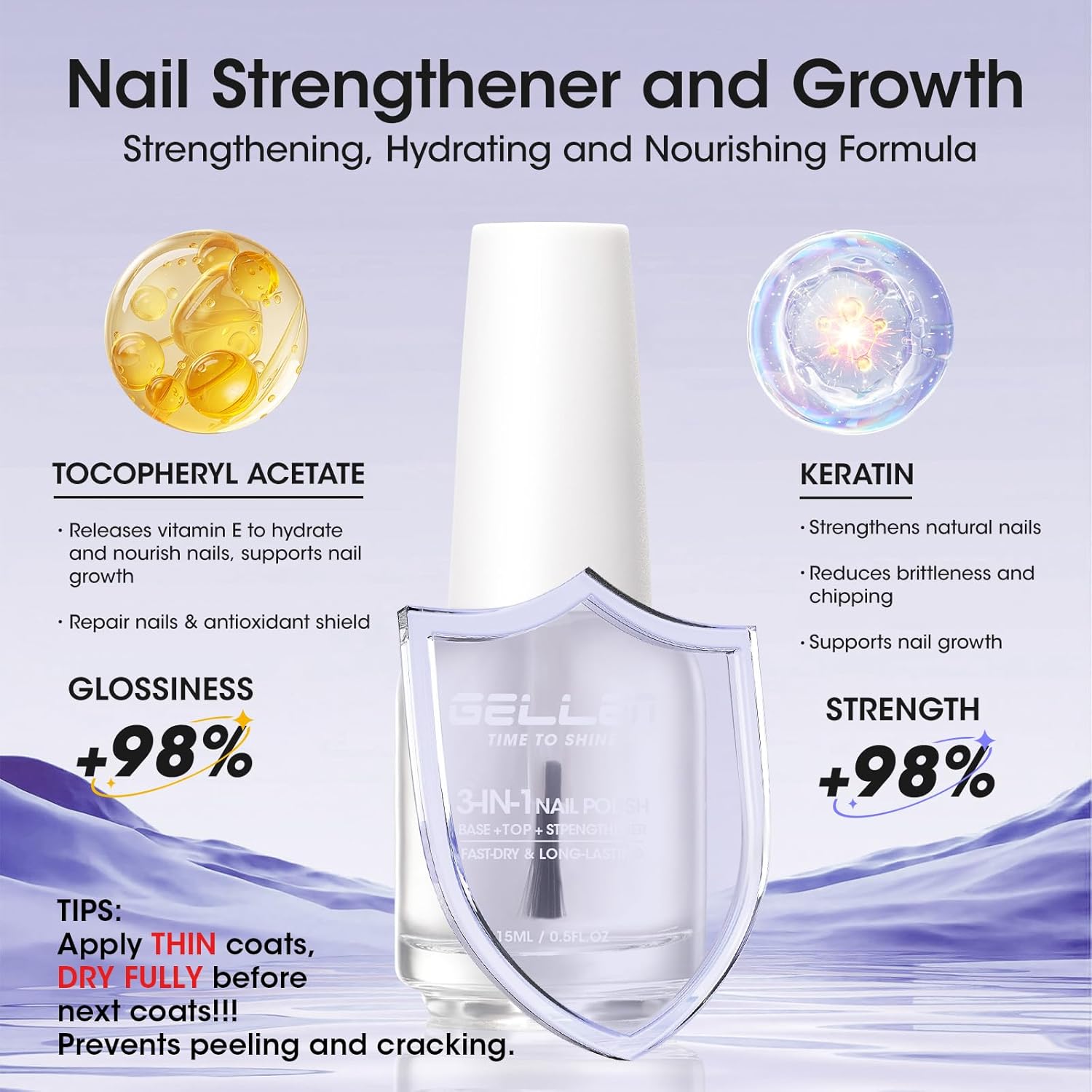 GELLEN 3-In-1 Clear Nail Polish Base Top Coat, Nail Strengthener Growth, Breathable Nail Polish, Treatment For Damaged Dry Nails, Keratin & Vit E, Air Dry, Hema Free, Non-toxic, Anti-yellowing