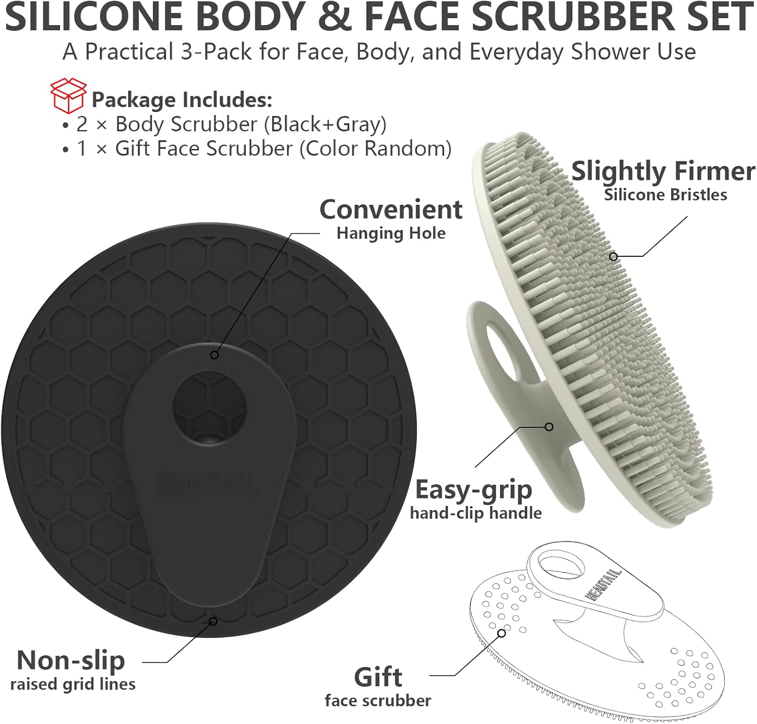 - Package Includes: 2 × Silicone Body Scrubber (Black+Gray) and 1 × Gift Silicone Face Scrubber (Color Random)