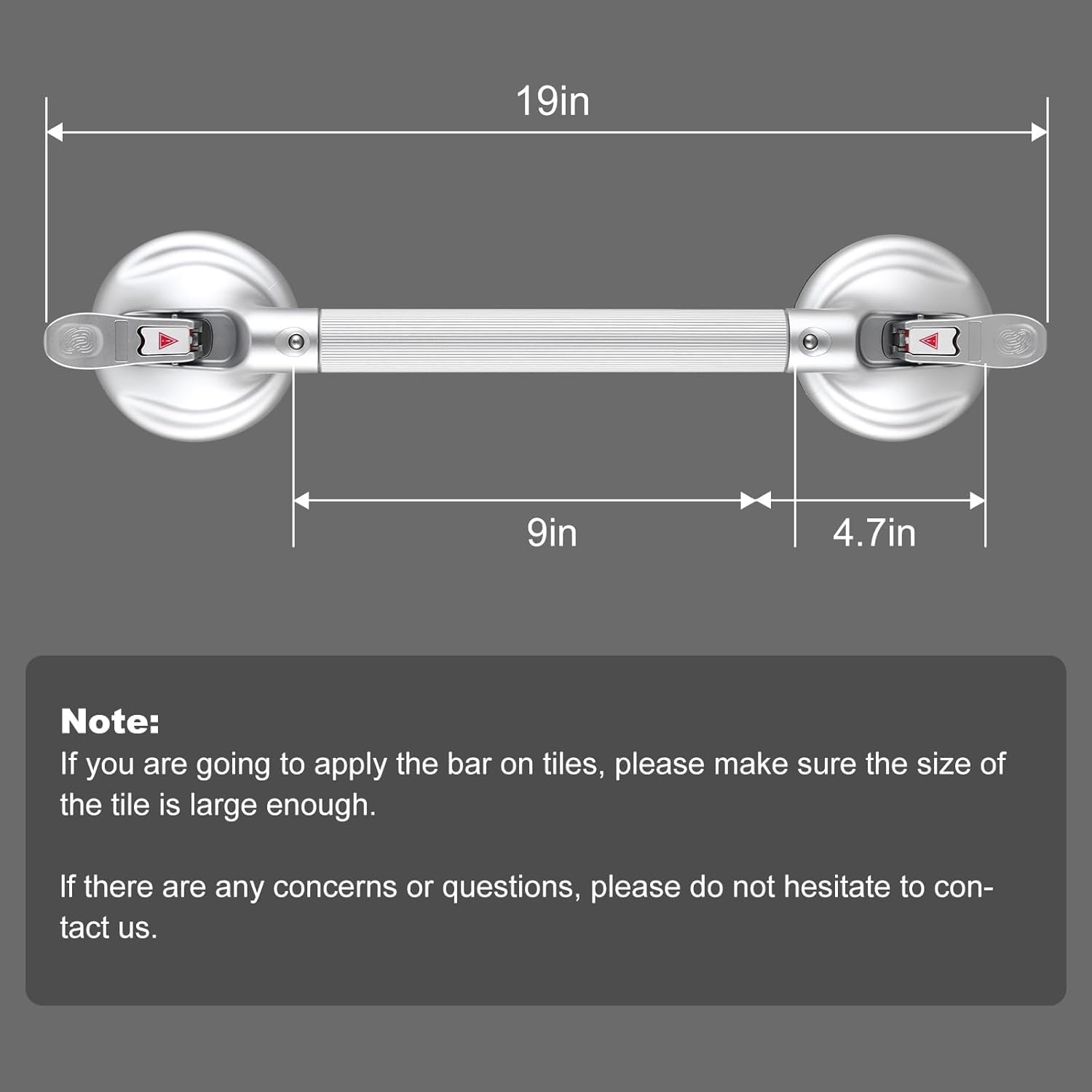 - 🦆【Buying Guides】 ① The grab bar is to be used only to assist and help support properly a person's body, Never apply full body weight. ② The mounting surface of the grab bars for elderly suction must be flat, non-porous, and smooth. And measure tiles and the distance between them prior to purchase as suction cups cannot overlap the grout line. ③ Check the stability of the suction cup periodically. Use with caution and test-proof the suction of cups before use.