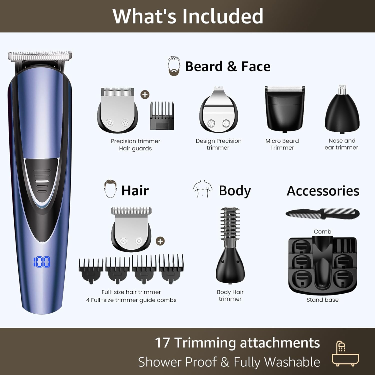 - Included Components : Blades, Brush, Case, Guide Combs, Trimmer, USB Cable