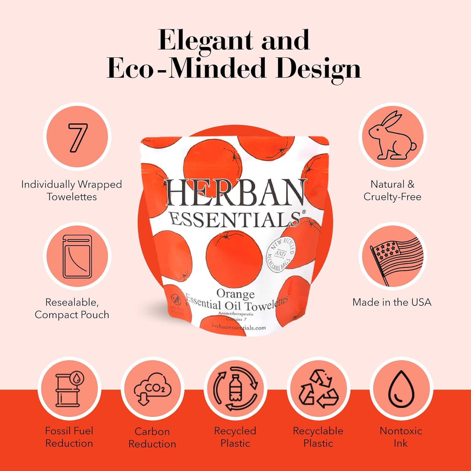 Herban Essentials - Orange Wipes & Towelettes - Essential Oil Wipes for Make Up, Hands, Face & Body - Travel Size Essentials & Toiletries - Natural, Individually Wrapped, Disposable & Moist (7 count)